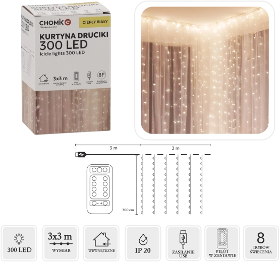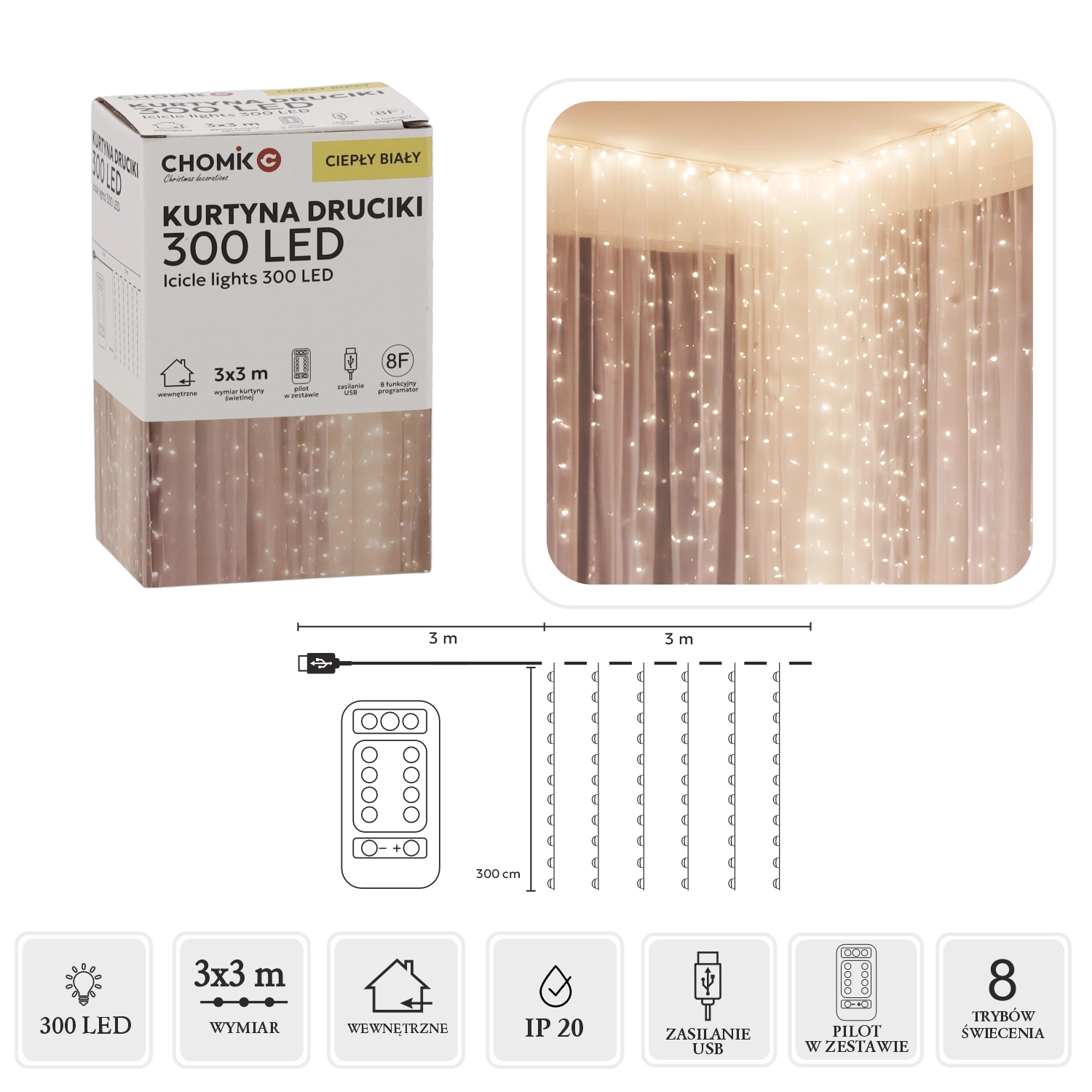 Guirlande lumineuse suspendue 300 LED blanc chaud 3 × 3 m avec USB et télécommande