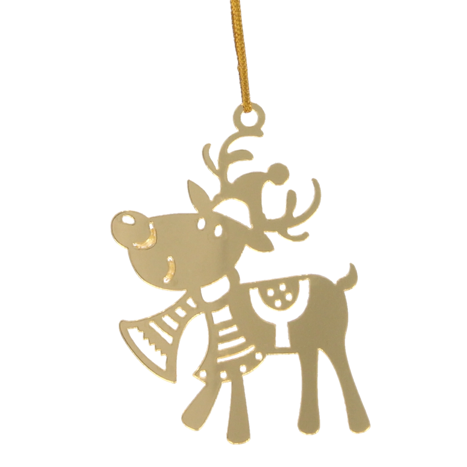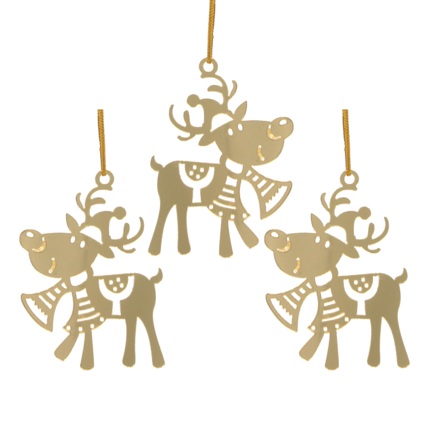 Un élégant set de trois décorations de Noël en forme de rennes apporte à votre décoration un luxueux éclat doré et une ambiance festive. Le plastique léger et résistant facilite la suspension sans alourdir les branches, et les dimensions compactes de 5,5 × 8 cm sont idéales pour le sapin, la couronne et d’autres décorations.