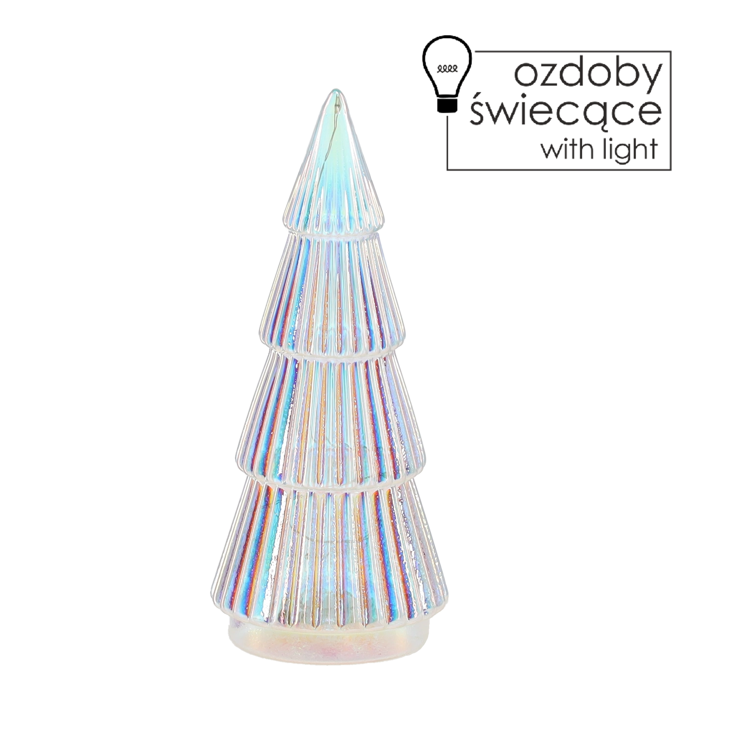 Élégant ornement de Noël en verre en forme de sapin argenté avec un éclairage LED qui illumine tout intérieur festif. Grâce à sa surface brillante et à sa lumière douce et économe, il crée une atmosphère agréable et s’intègre facilement à une décoration traditionnelle ou moderne. Ses dimensions compactes permettent de le placer sur une table, une étagère ou de l’intégrer à une décoration plus grande.
