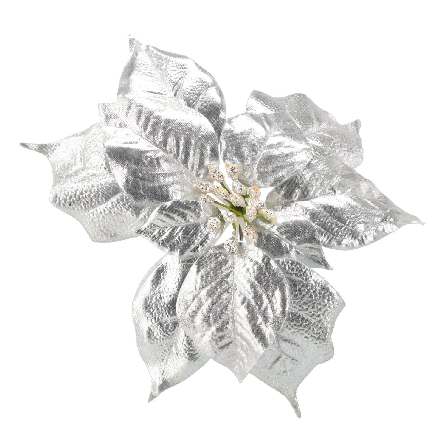 Élégante étoile de Noël (poinsettia) artificielle d’une hauteur de 25 cm en finition argentée, apportant une touche festive et scintillante à votre intérieur. Un matériau de qualité imite fidèlement l’aspect de la fleur naturelle et le clip pratique permet une fixation facile sur le sapin, les couronnes, les guirlandes et autres décorations.