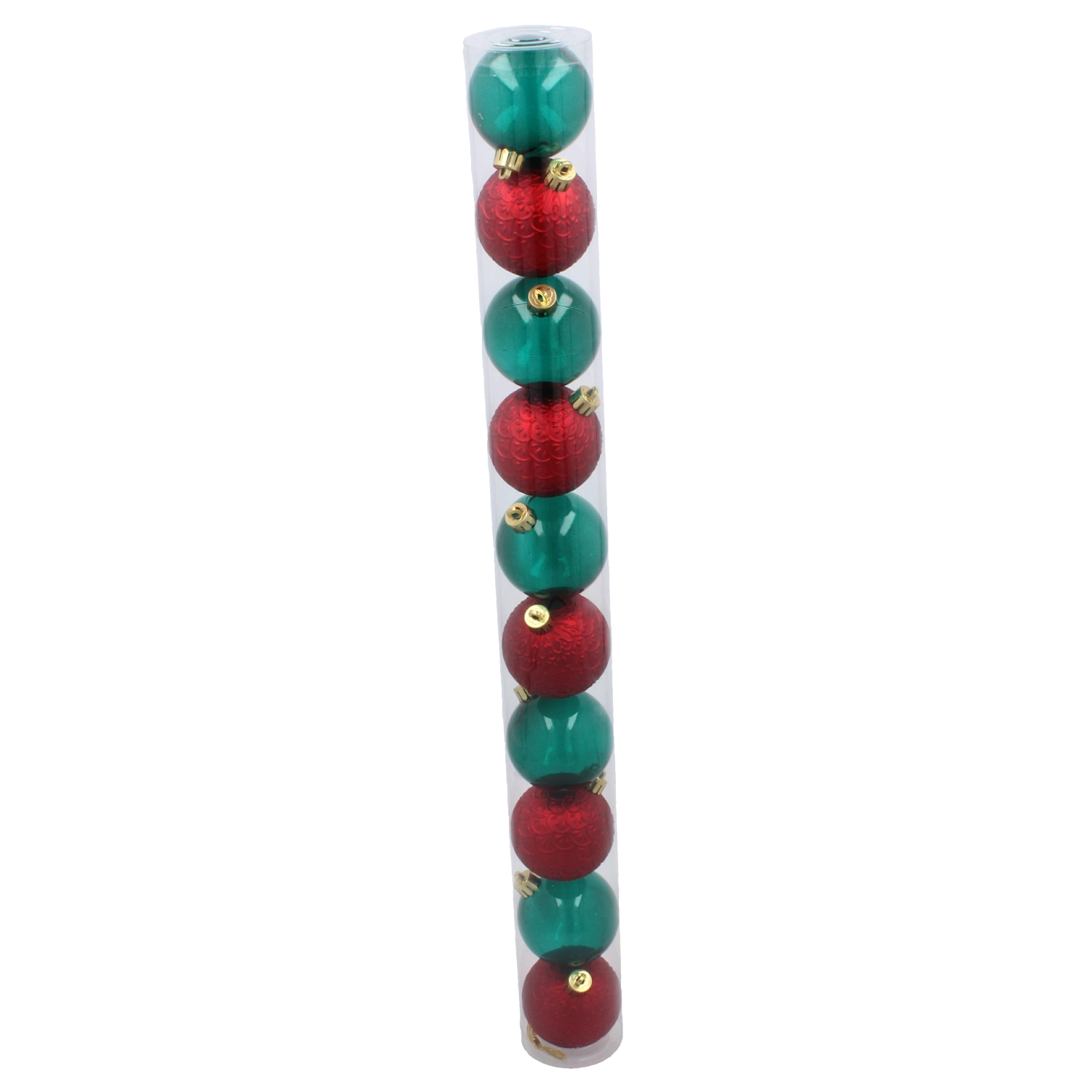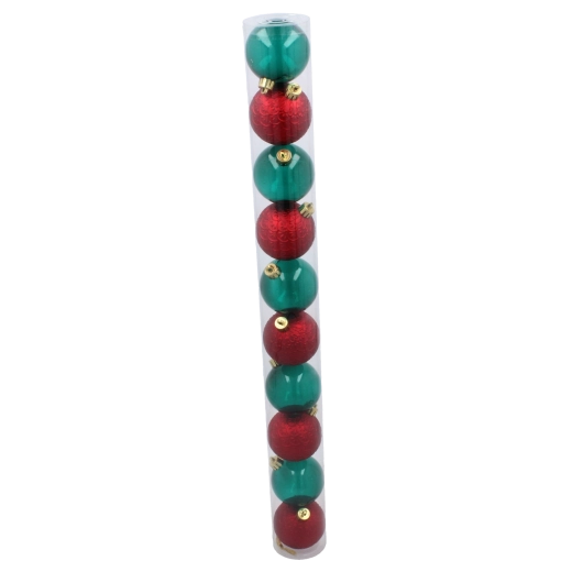 Élégant lot de dix décorations de Noël de 6 cm de diamètre, dans une combinaison de couleurs rouge et vert bouteille, qui apporte un charme traditionnel à votre sapin. Matériau résistant incassable et mélange de finitions brillantes et mates reflétant joliment la lumière et garantissant une longue durée de vie. L’emballage pratique en tube transparent facilite le rangement et le transport.