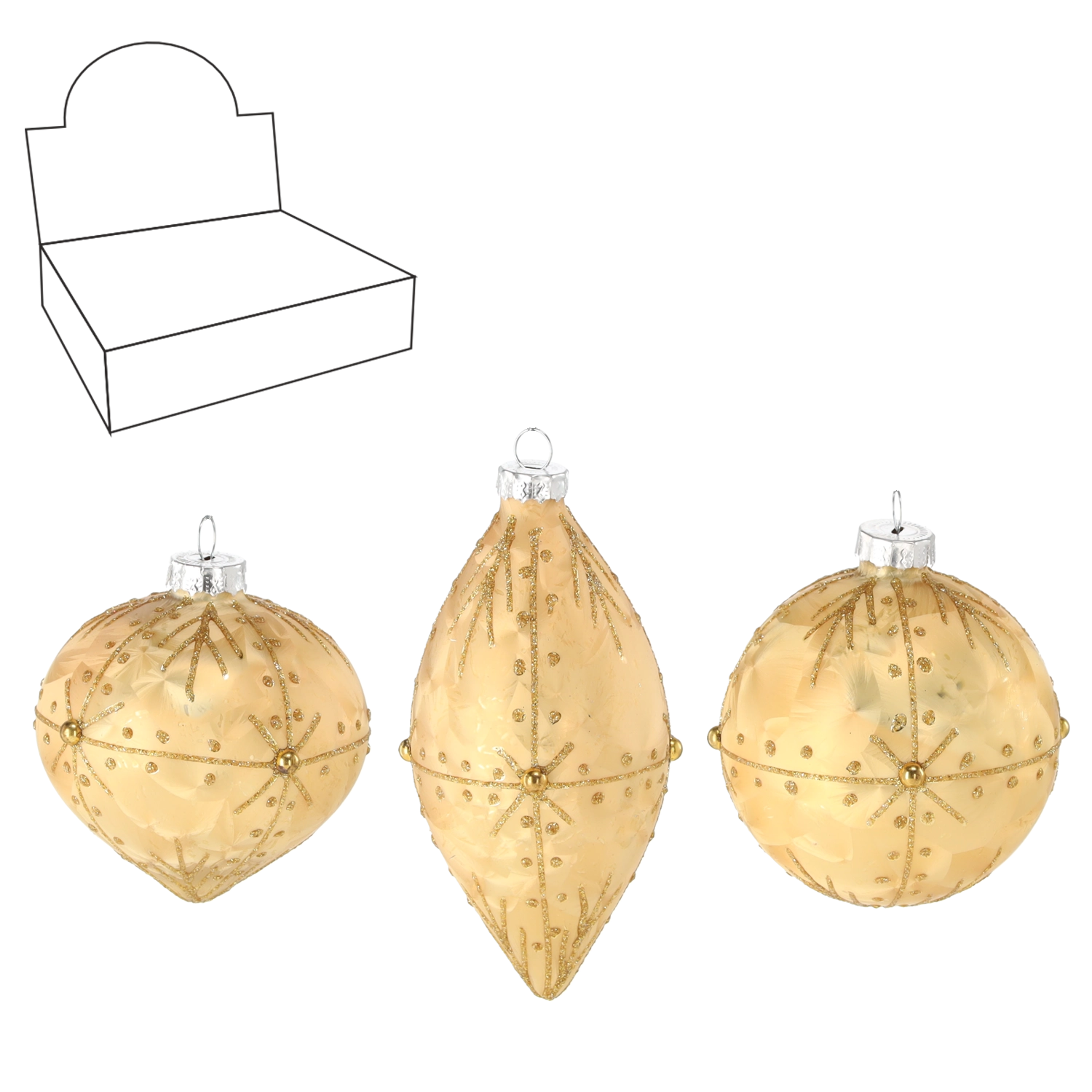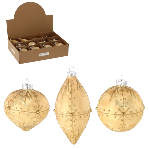 Élégantes boules de Noël en verre dans une luxueuse teinte dorée qui apporteront un véritable éclat à votre sapin. Le set combine un mélange de formes pour un effet saisissant : boules rondes de 8 cm de diamètre et décorations allongées de 6 × 13 cm. Les détails décorés à la main et le design doré classique soulignent l’atmosphère festive et s’harmonisent facilement avec le reste de votre décoration.