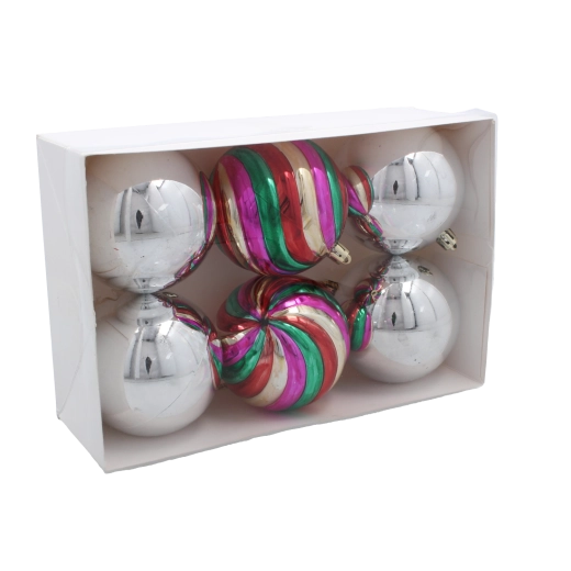 Ce set design de 6 boules de 8 cm de diamètre combine l’élégance argentée intemporelle avec des ornements rayés ludiques en rose, vert, rouge et or. Leur surface brillante reflète magnifiquement la lumière et crée une atmosphère festive au rendu premium.