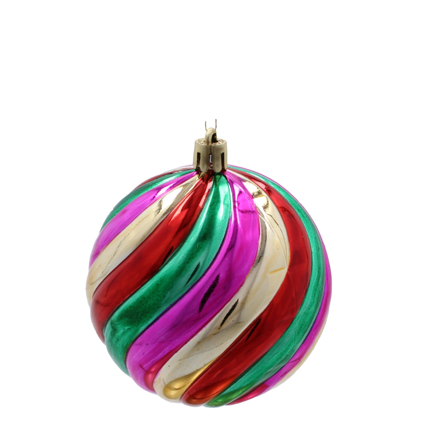 Des boules à spirales colorées en rose, vert, rouge et or apportent un accent marqué et une énergie festive au sapin.