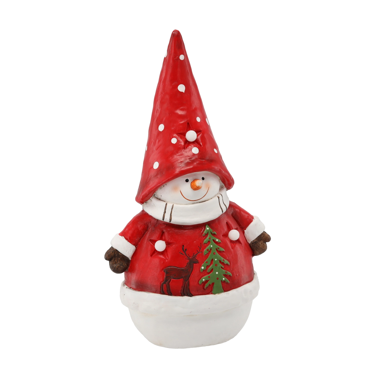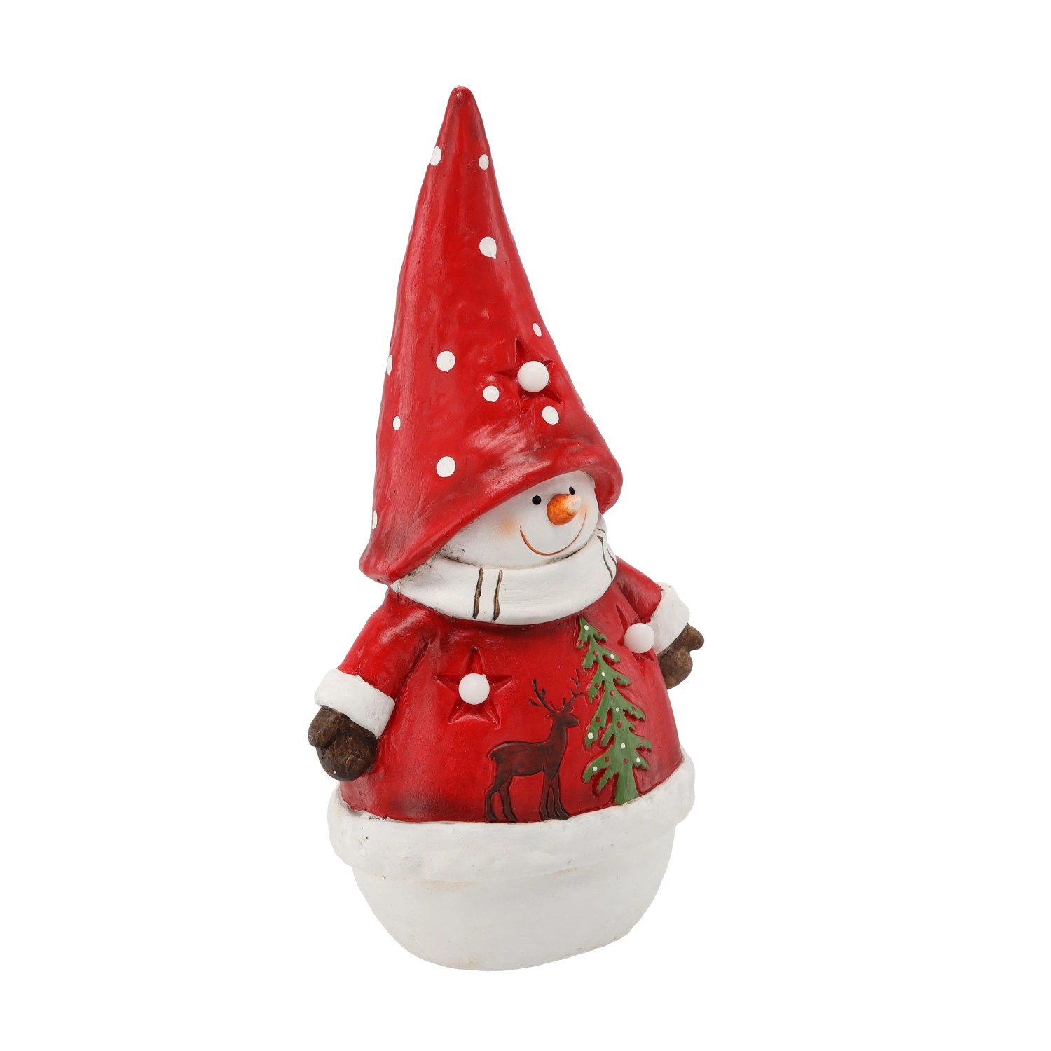 Bonhomme de neige avec bonnet et manteau rouges à pois blancs, motifs de renne et de sapin. La finition brillante souligne la magie des fêtes.