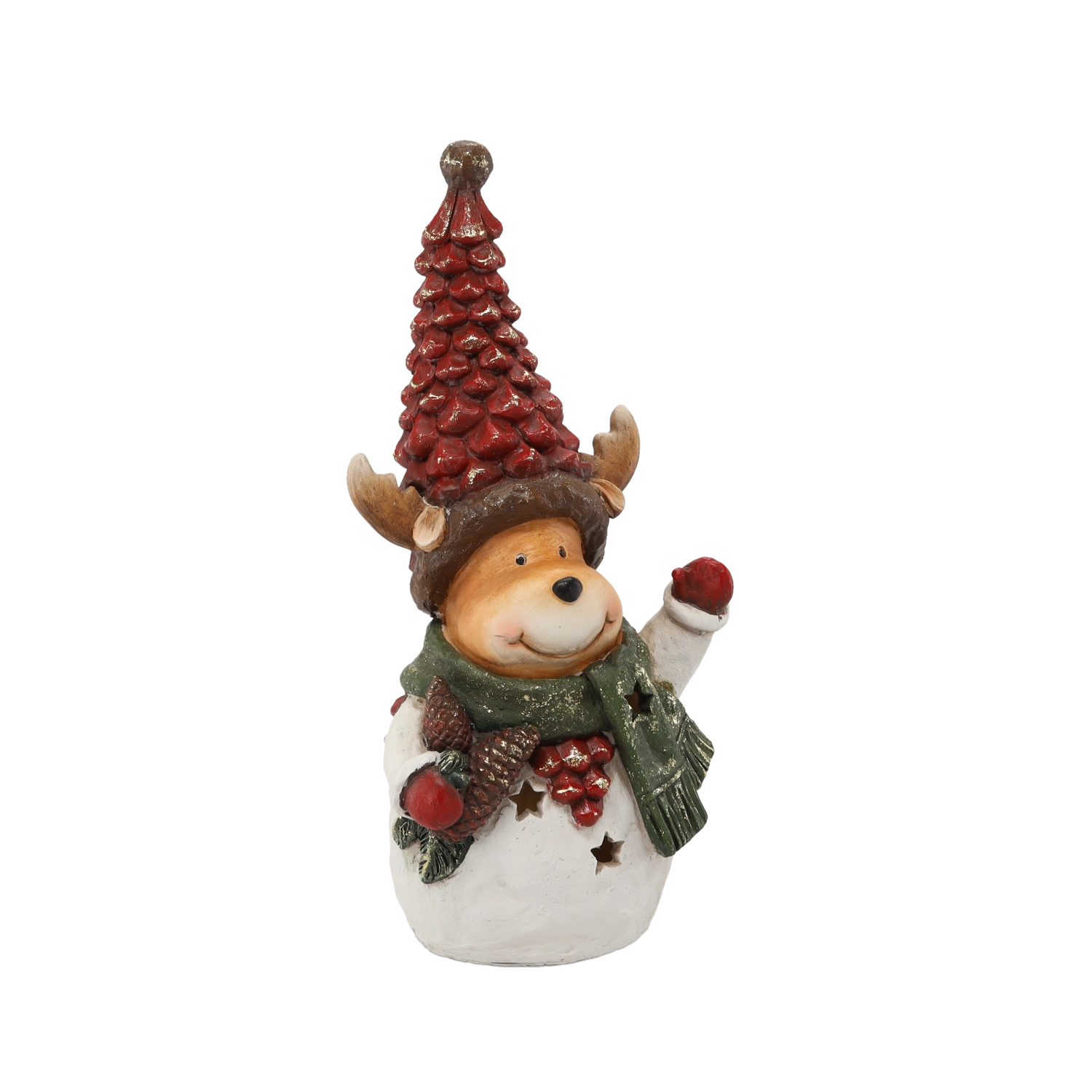 Élégante décoration de Noël en résine polyuréthane résistante, elle apporte chaleur et ambiance festive à votre intérieur. La figurine d’ourson ou de renne avec bonnet tricoté et écharpe est peinte avec soin et, grâce à la lumière LED, diffuse un éclat délicat à travers les découpes étoilées du corps.