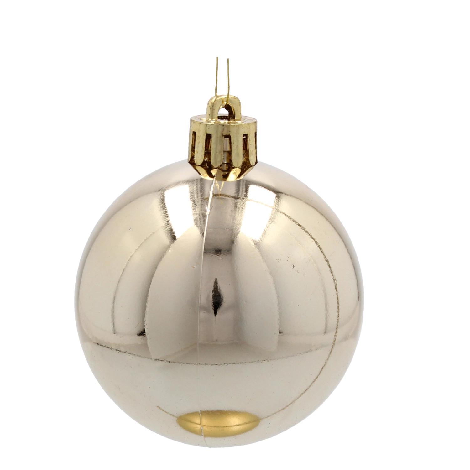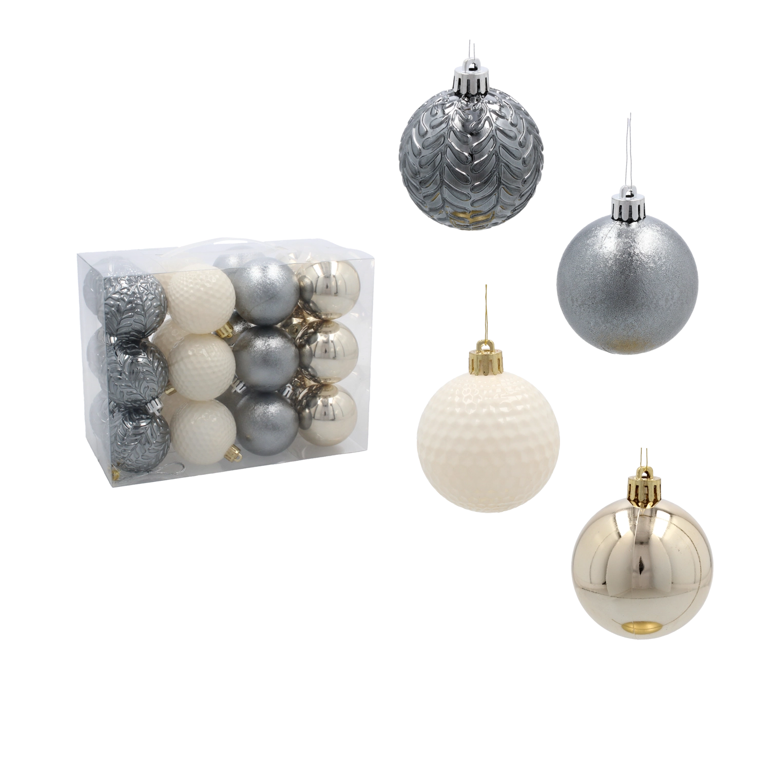 Offrez à vos fêtes de fin d’année une élégance intemporelle. Ce set soigneusement assorti de 24 boules en plastique dans les couleurs champagne, gris et blanc propose une combinaison équilibrée de surfaces brillantes, mates et pailletées, apportant profondeur, reflets lumineux et look premium.