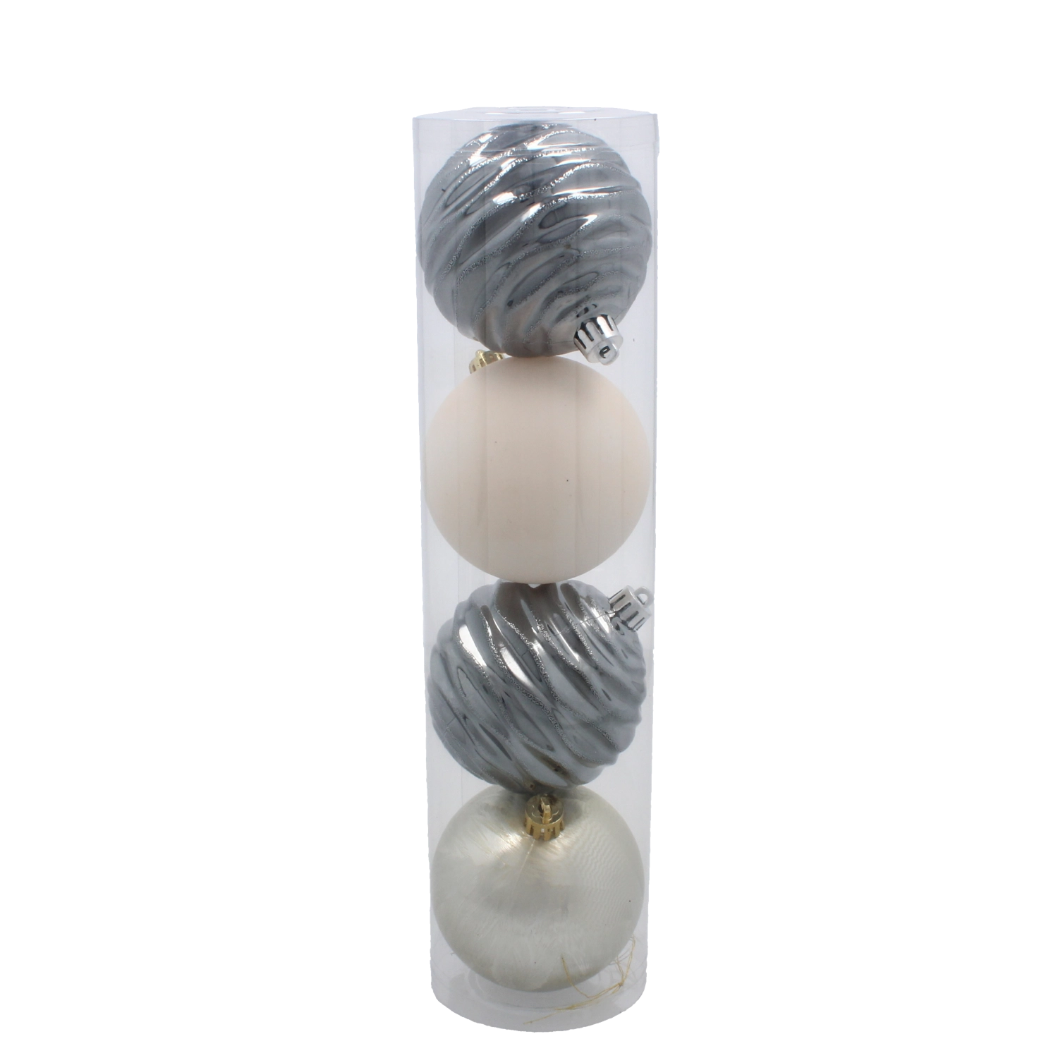 Élégant set de quatre boules de Noël de 8 cm de diamètre dans des tons champagne, gris et blanc, apportant à la décoration un look sophistiqué et une harmonie. Le plastique résistant garantit une manipulation sûre et une longue durée de vie, tandis que le mix de finitions mates, brillantes et pailletées crée un contraste spectaculaire. Le tube transparent pratique sert au rangement, à l’exposition et facilite l’emballage cadeau.