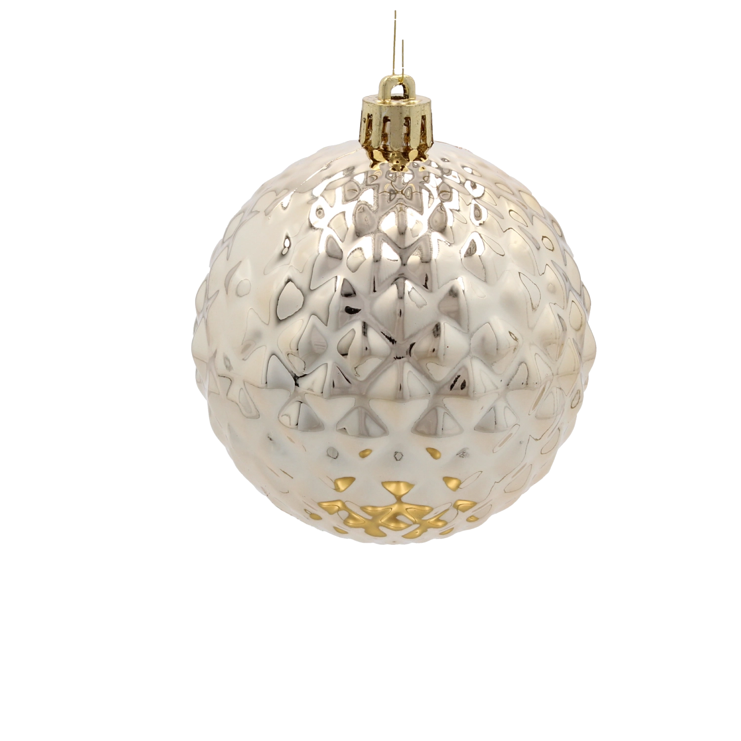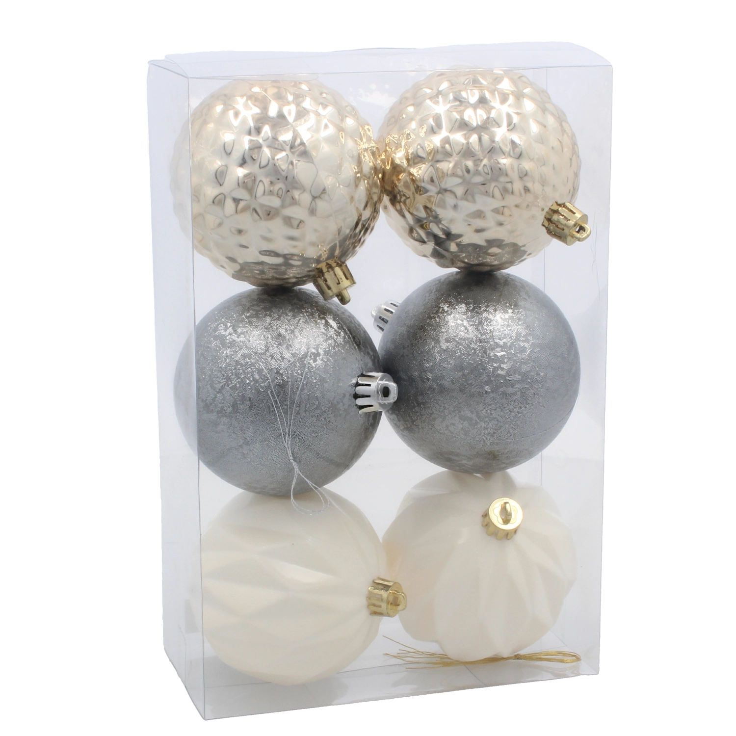 Ce set de boules en verre, soigneusement assorti, combine des surfaces texturées, mates et lisses pour un effet moderne et délicat. La palette champagne, argent et blanc se marie facilement avec d’autres décorations et crée un rendu cohérent sans surcharge visuelle.