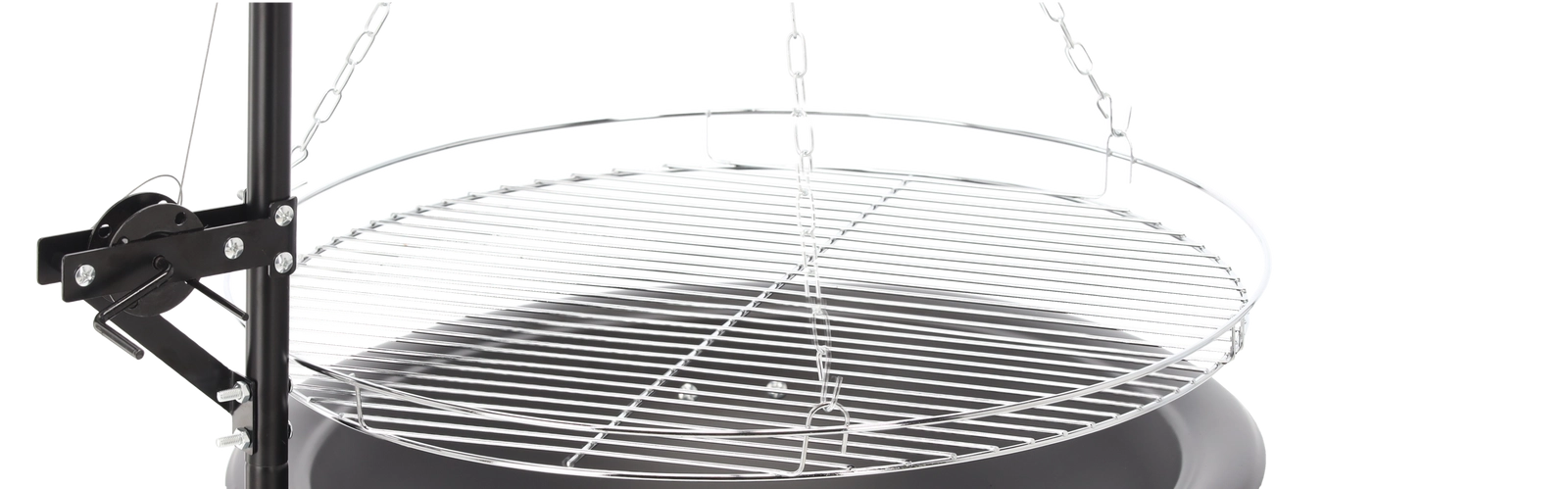 La grille circulaire chromée de 50 cm de diamètre offre suffisamment d’espace pour cuisiner pour toute la famille. La commande simple du levage de la grille (chaînes/manivelle selon la version) permet une cuisson précise sans brûler les aliments. Le design métallique minimaliste s’intègre à tout jardin, chalet ou terrasse.