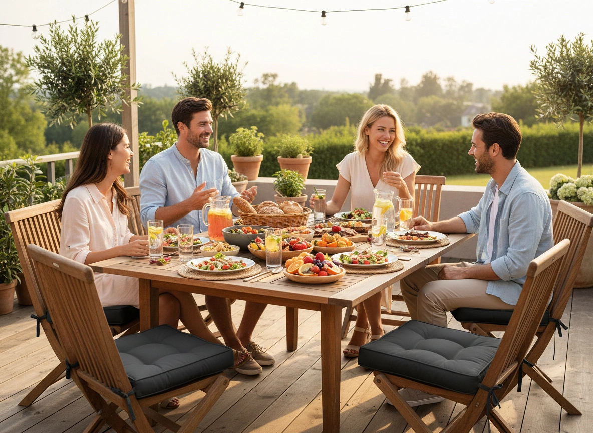 Un rembourrage de six centimètres en fibre polyester soulage le dos et les hanches et rend plus agréables les longues périodes assises lors des repas ou autour d’un café.