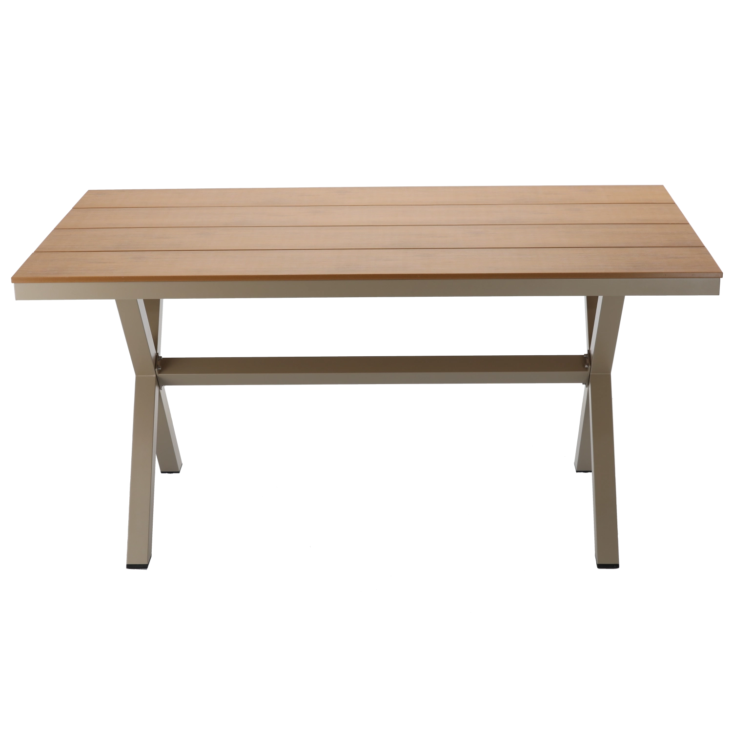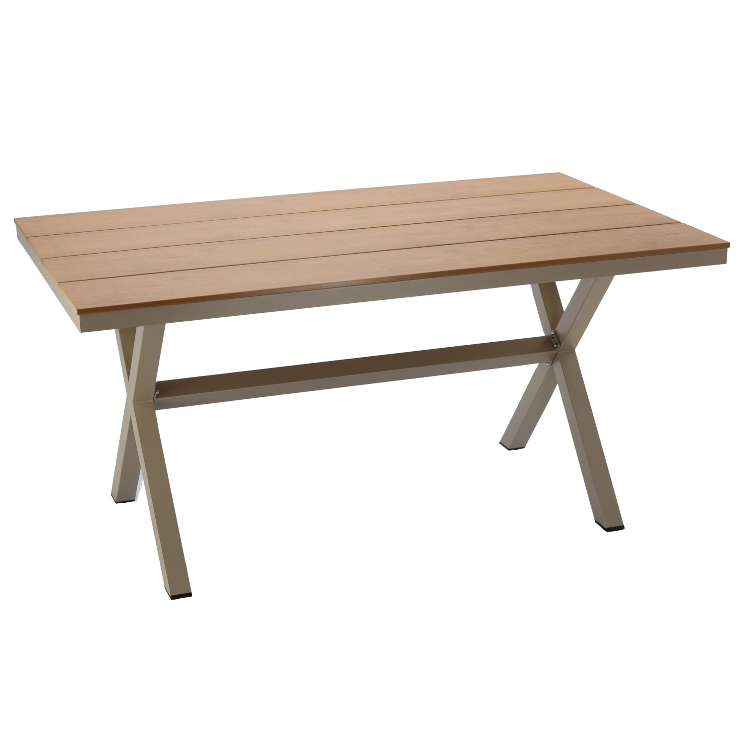 Cette table moderne en aluminium de couleur beige est conçue pour l’extérieur – elle est légère à déplacer, tout en restant stable et, grâce au revêtement par poudre, elle résiste très bien aux intempéries. Le plateau en matériau composite à décor bois offre l’apparence du bois sans entretien contraignant.