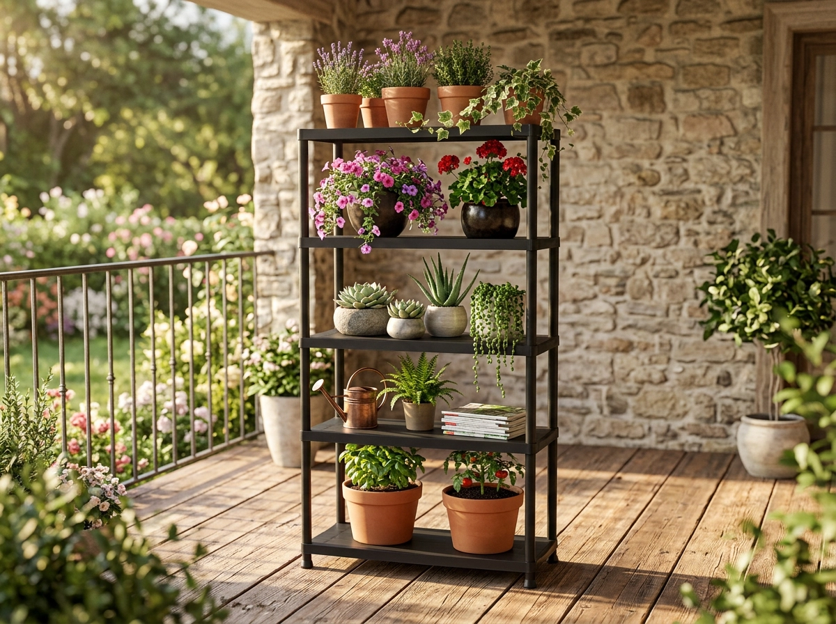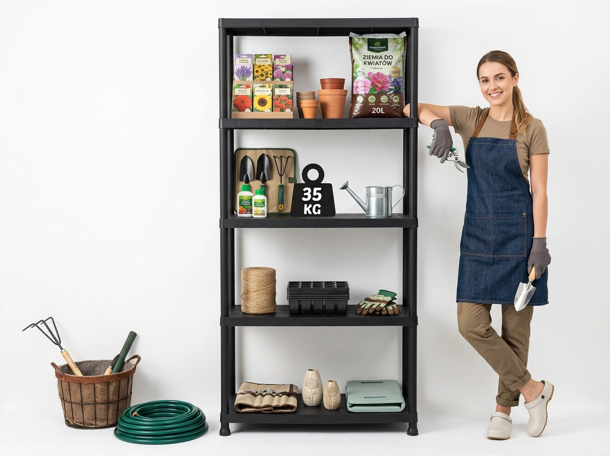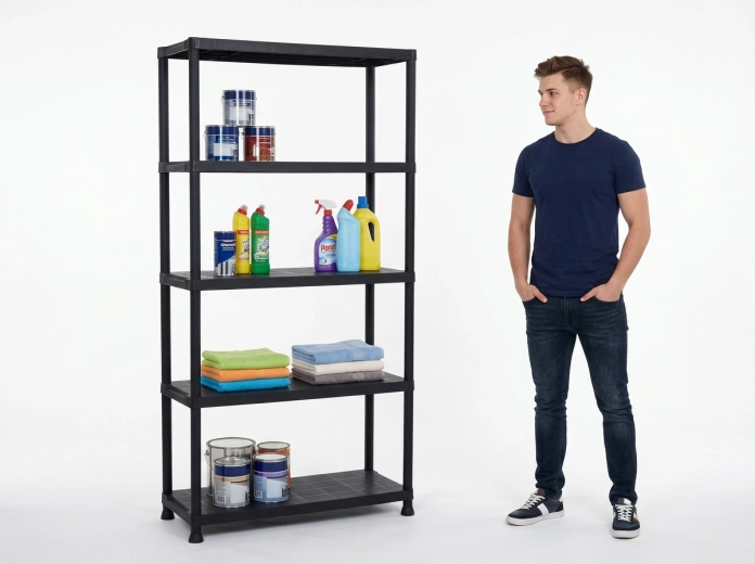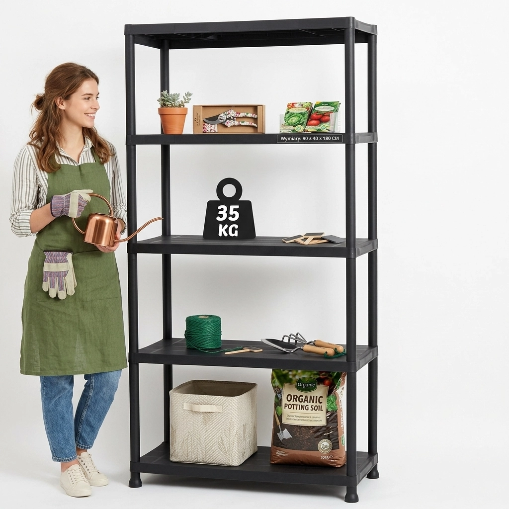Étagère pratique et résistante à cinq niveaux pour un rangement clair à la maison, dans l’atelier ou le garage. Offre une capacité de charge jusqu’à 35 kg par étagère, un montage facile sans outils et un plastique durable adapté à l’intérieur comme à l’extérieur.