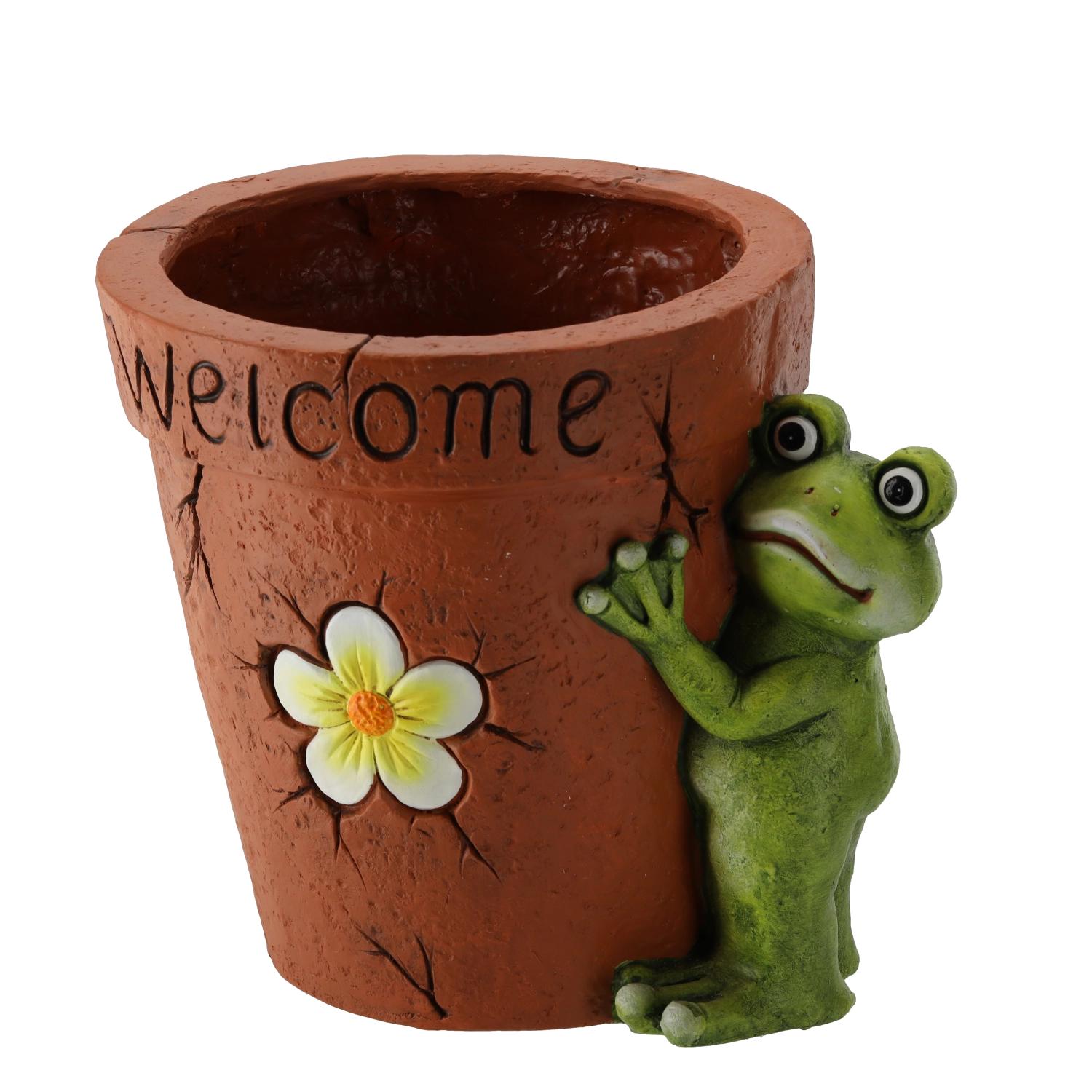 - grenouille avec fleur et inscription « Welcome », aspect terre cuite texturé