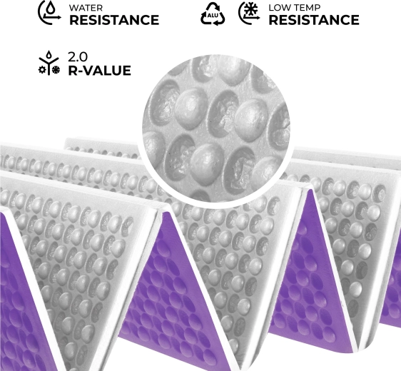 Réfléchit la chaleur corporelle vers l’utilisateur ou isole du sol froid selon l’orientation du tapis. Convient à une utilisation trois saisons.