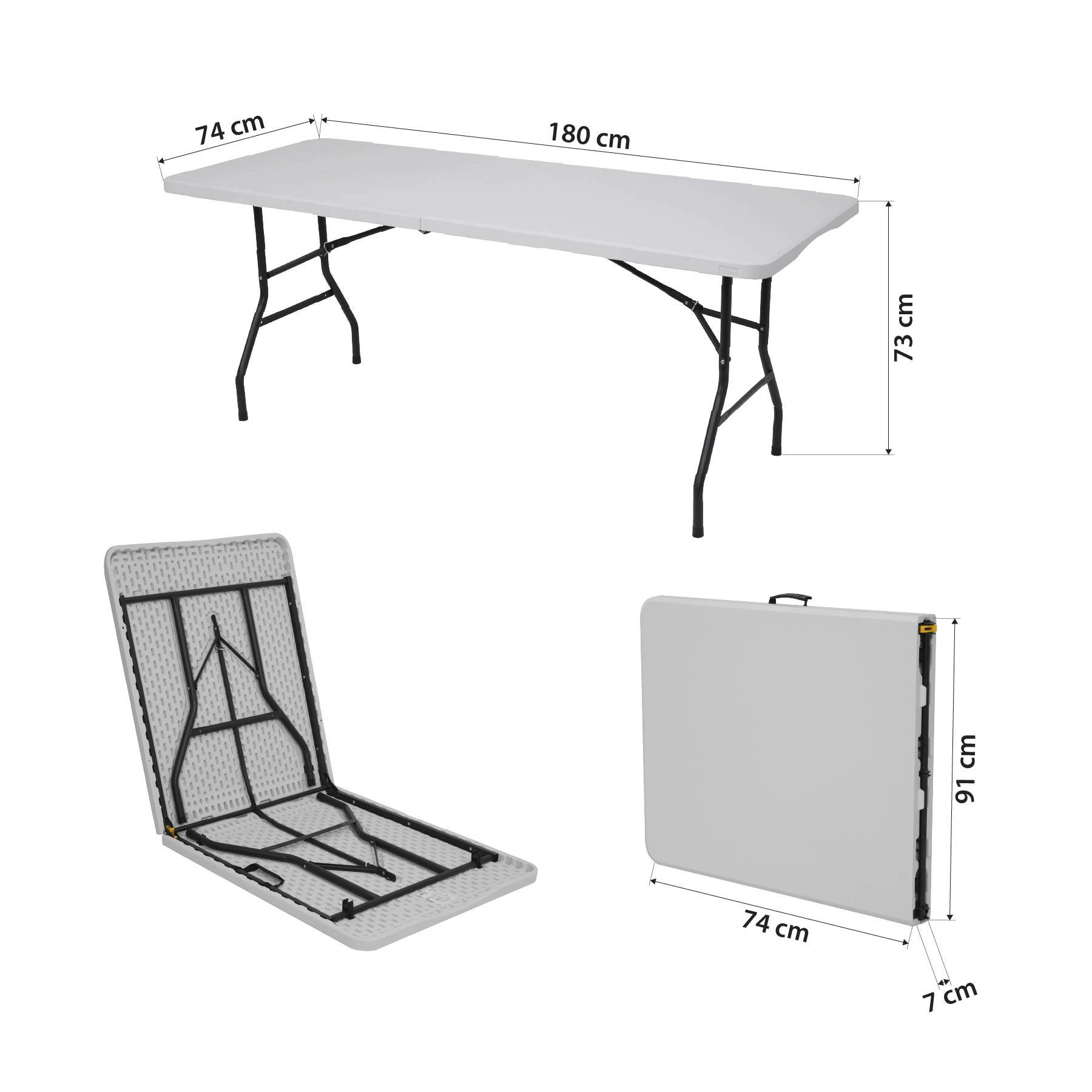 Sa grande surface de 180 × 74 cm offre suffisamment d’espace pour les invités, les rafraîchissements et l’équipement. La hauteur ergonomique de 73 cm est confortable aussi bien assis que debout. Le système de pliage pratique transforme la table en une « valisette » compacte avec poignée de transport, afin que vous puissiez la ranger facilement dans la voiture, une armoire ou sous le lit.