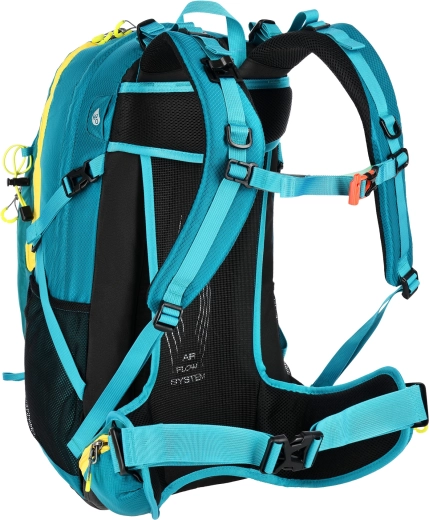 Les bretelles rembourrées, la sangle sternale réglable en hauteur avec sifflet et la large ceinture lombaire répartissent la charge et améliorent la stabilité. Le panneau dorsal ventilé Air Flow avec renfort en acier soulage le dos même lors de longues randonnées.