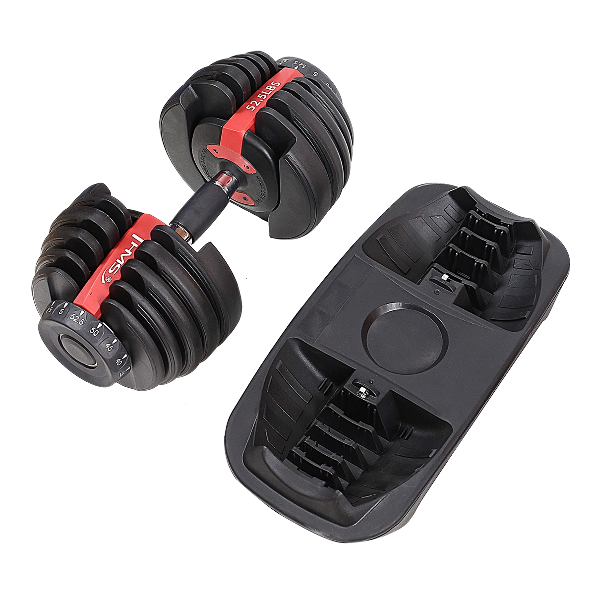 Un seul haltère remplace un jeu complet. Le support de rangement garde tout clair et sécurisé au même endroit.