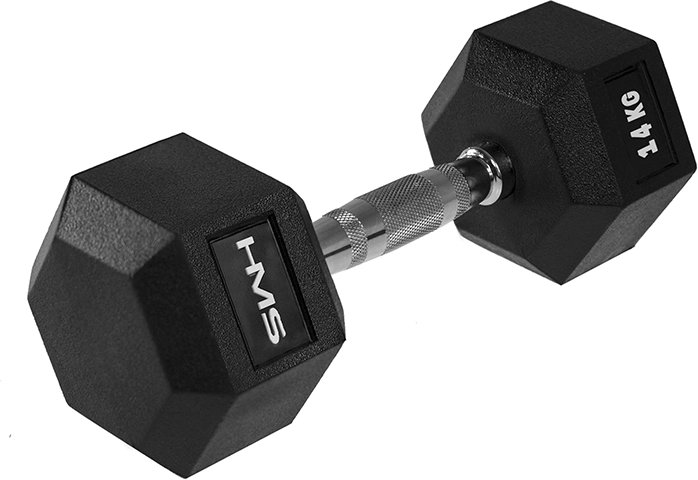 Haltère hexagonal professionnel HMS de 14 kg pour salles de sport domestiques et commerciales. Il offre des têtes en caoutchouc résistantes, une poignée moletée chromée pour une prise sûre et une forme hexagonale antiroulis pour un entraînement sûr et confortable.
