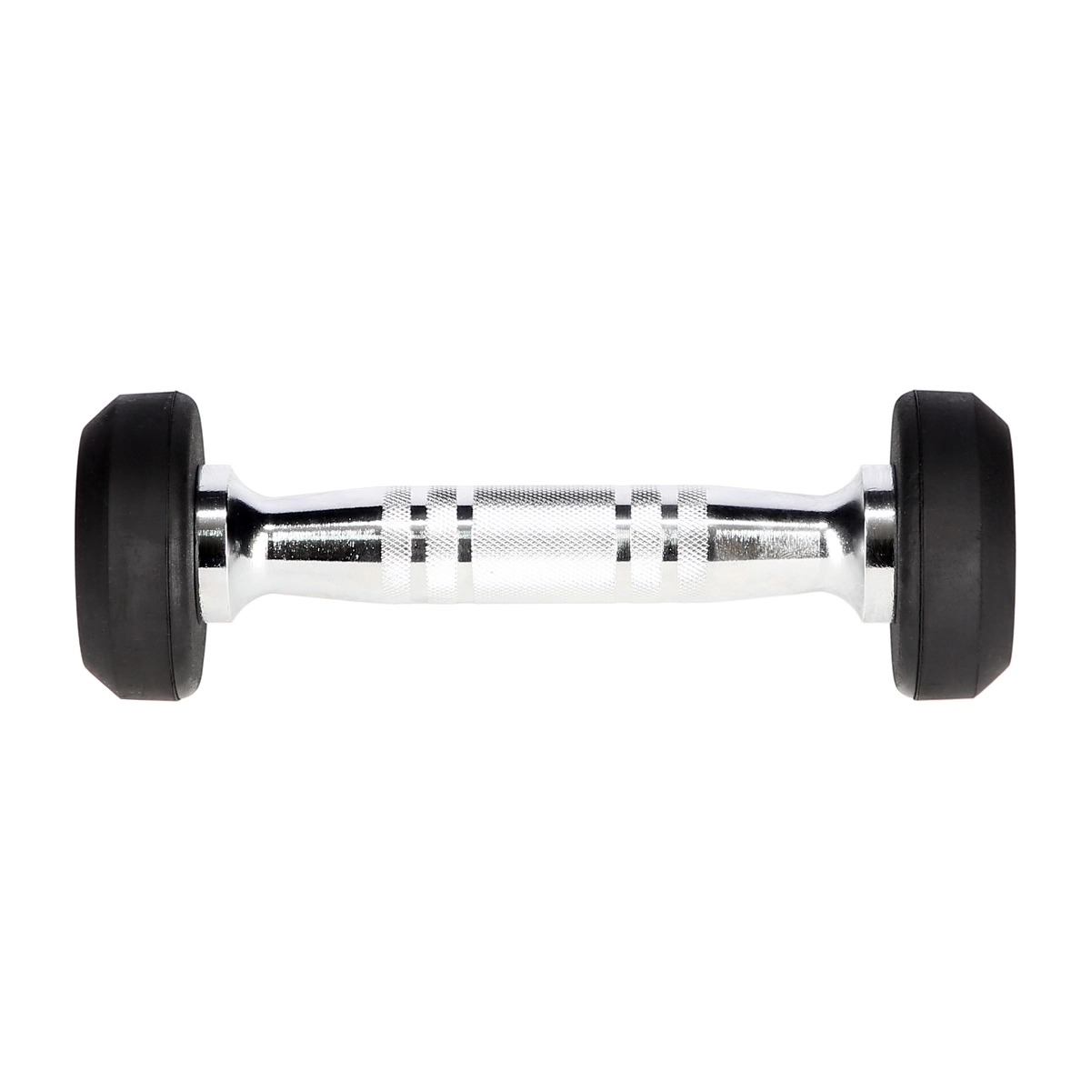 Poignée en acier chromé, forme tonneau et moletage prononcé pour une prise sûre et confortable à chaque exercice.