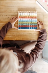 Des cubes en bois colorés avec des exercices motivent les enfants à découvrir et à réviser la table de multiplication chaque jour.