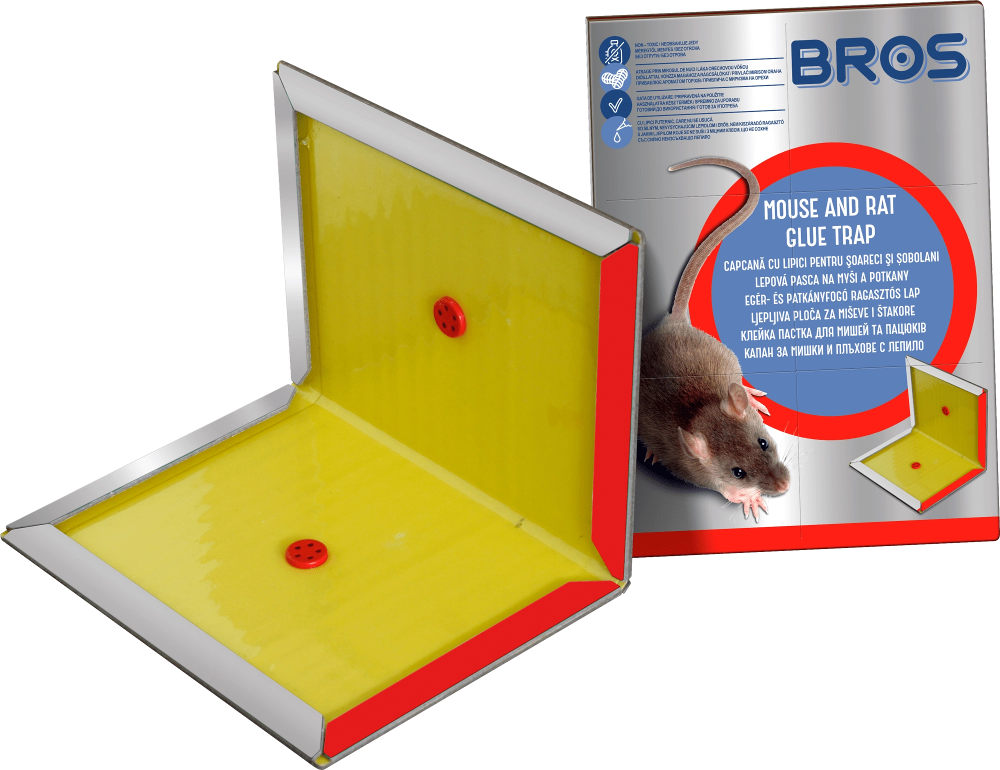Piège collant pratique et efficace BROS pour souris et rats pour une utilisation en intérieur et dans les bâtiments agricoles. Sans poison, inodore et, grâce à sa colle puissante, il retient fiablement les rongeurs. Sa formule moderne ne sèche pas, est résistante aux variations météorologiques et dégage un parfum de noix agréable pour augmenter l’efficacité.