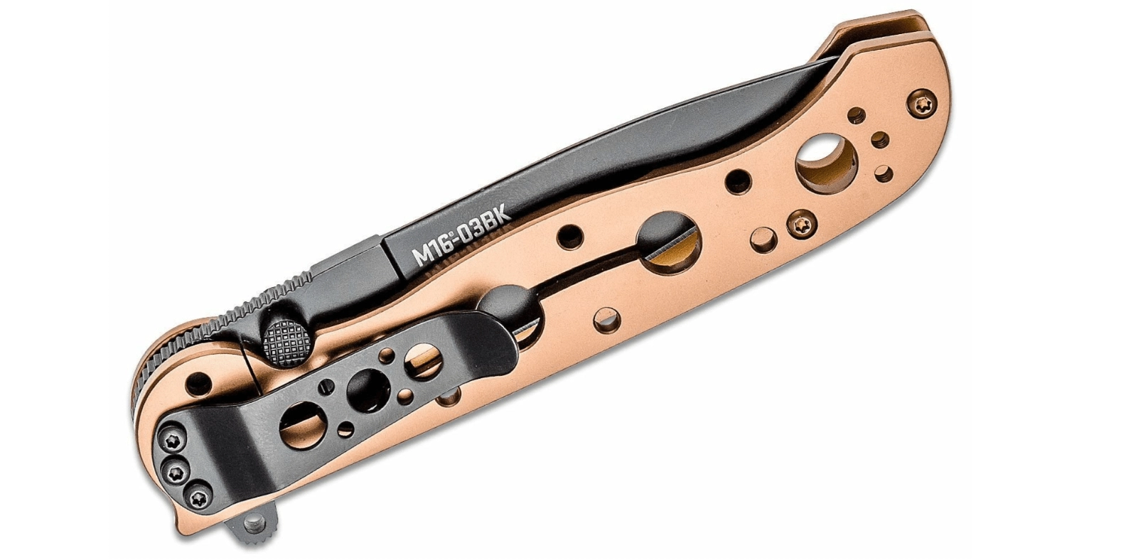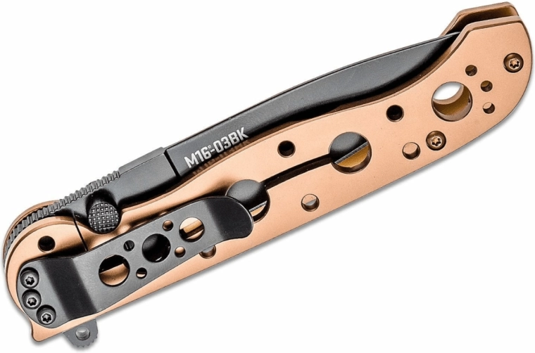 L’élégant couteau EDC CRKT M16-03BK offre des performances fiables dans un format compact. Il est doté d’une lame en acier inoxydable 12C27 avec finition noire Black Oxide, d’un ouverture rapide par flipper et ergot de pouce, et d’une sécurité assurée par le verrou Frame Lock. Le manche en acier avec finition bronze titane est allégé par des évidements et équipé d’un clip pour port en poche.