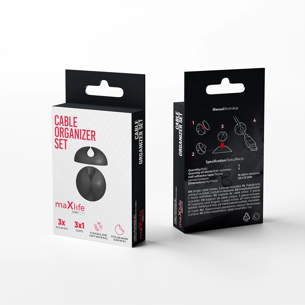 Maxlife organiseur de câbles 3×1 est un accessoire discret qui dompte les câbles de charge, de données et d’écouteurs. Chaque support possède 1 ouverture dédiée pour guider fermement le câble et est doté d’une couche autocollante pour une installation rapide sur le bord d’un bureau, une étagère ou un panneau latéral.