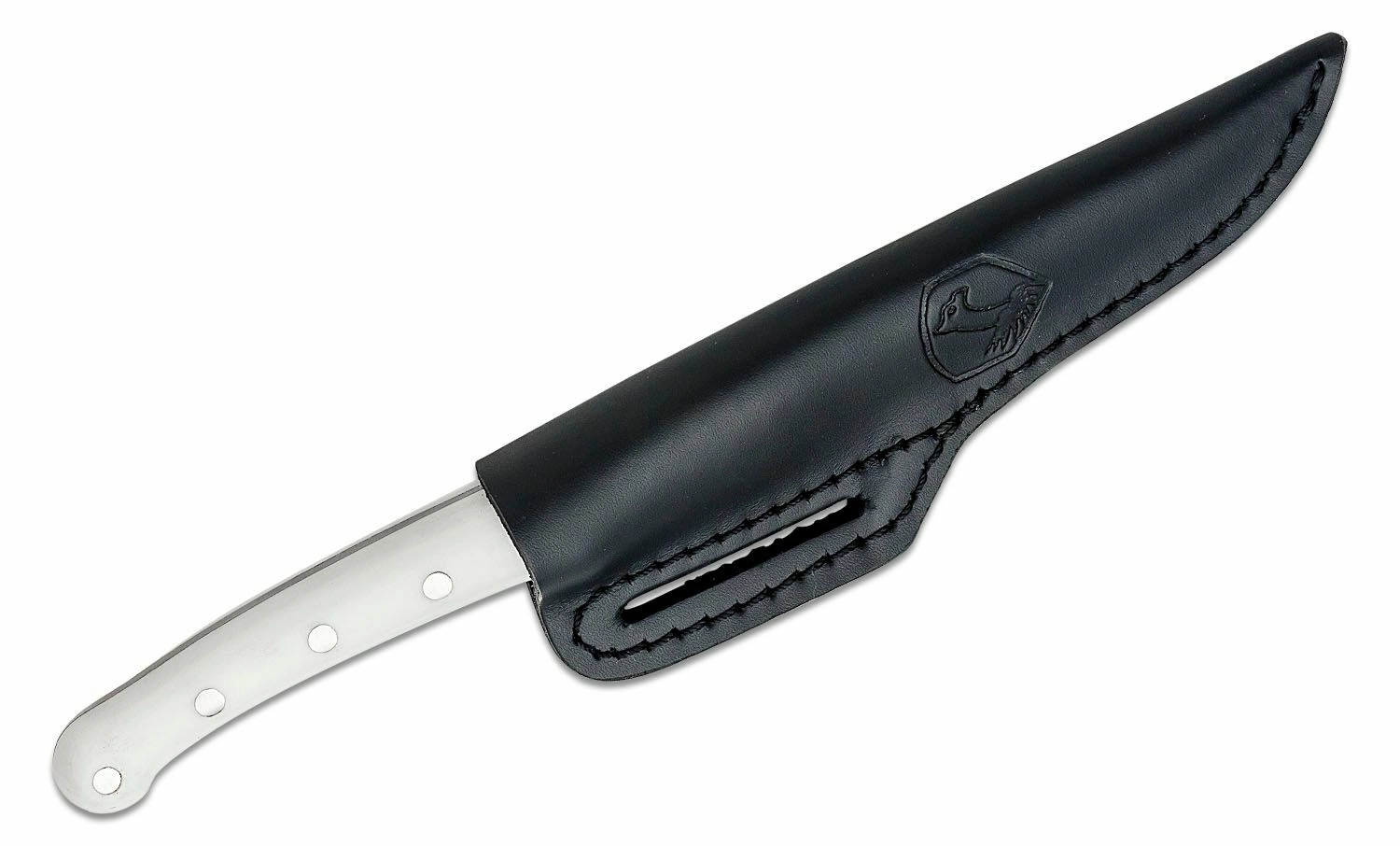La poignée ergonomique blanche en Micarta, matériau durable, offre une prise sûre même humide, tandis que la fixation rivetée renforce l’ensemble. Le couteau est livré avec un étui en cuir pour un port sûr et confortable à la ceinture.