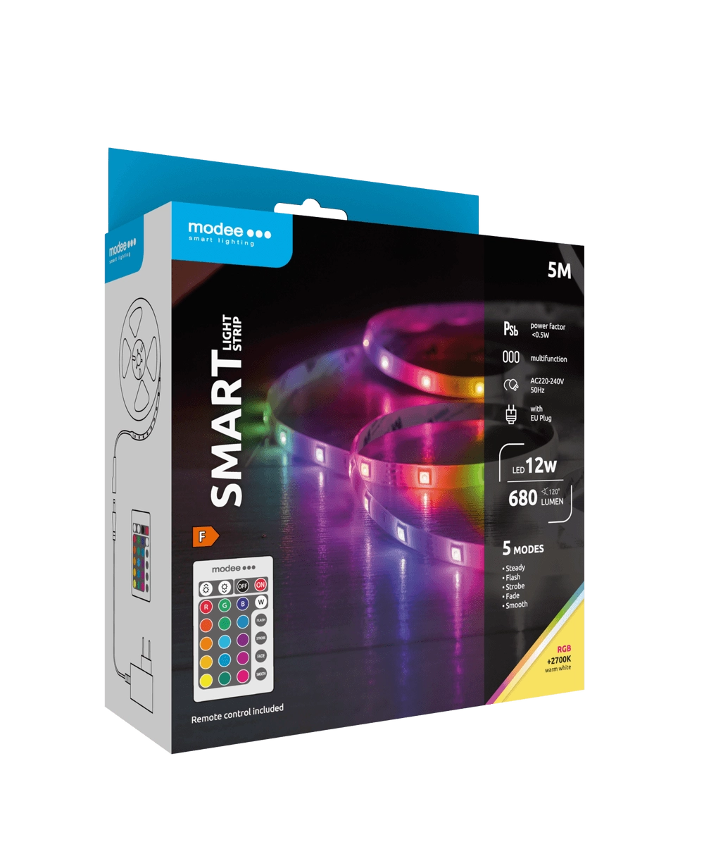 Découvrez un éclairage polyvalent avec le ruban LED intelligent MODEE, capable de produire une lumière blanc chaud 2700K et des effets colorés RVB pour toutes les ambiances. Le contrôle est un jeu d’enfant grâce à la télécommande – changez la couleur, la luminosité et le programme d’une simple pression. La fonction mémoire enregistre en plus le dernier mode utilisé.