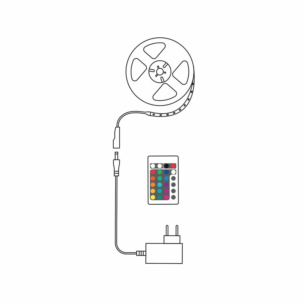 Contenu de l’emballage : 1× ruban LED 5 m, 1× adaptateur secteur avec fiche EU (150 cm), 1× télécommande (pile CR2025 incluse).