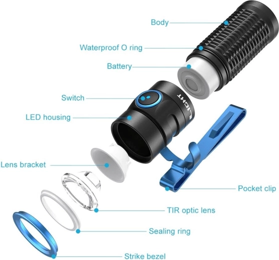 La construction en alliage d’aluminium avec une nouvelle texture antidérapante offre une prise en main sûre, même avec des gants. Le clip de poche bidirectionnel permet un port sur la poche, le sac à dos ou la visière de casquette comme lampe frontale improvisée, tandis que la base plate magnétique permet de poser la lampe sur une table ou de la fixer sur du métal pour un éclairage mains libres.
