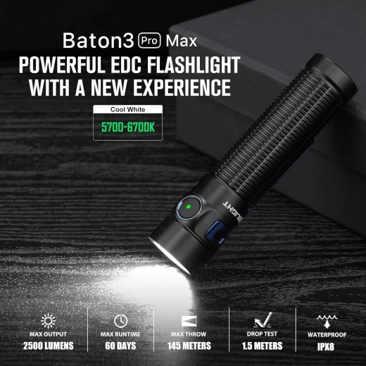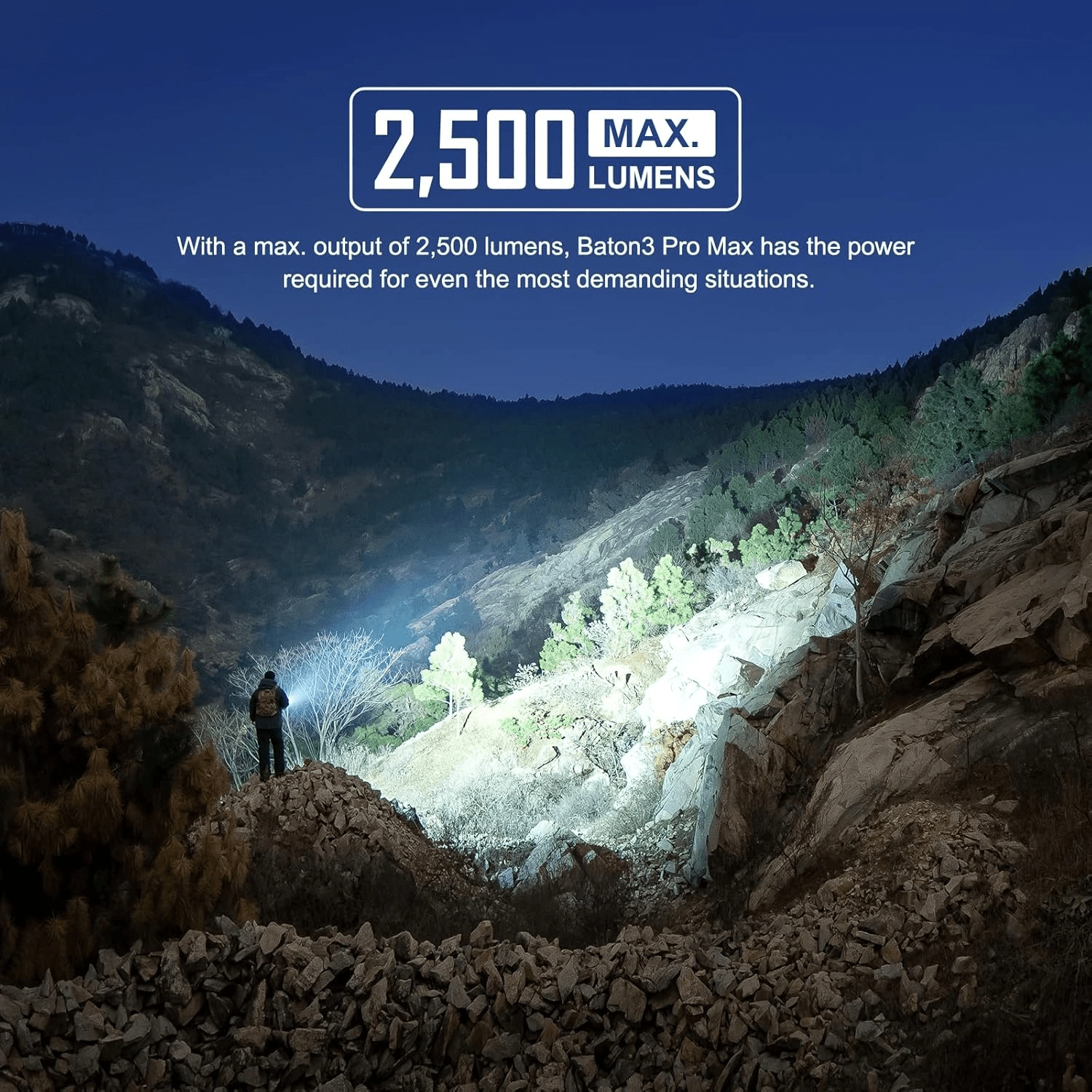 L’OLIGHT Baton 3 Pro Max est une lampe EDC performante qui combine des dimensions compactes avec un flux lumineux maximal de 2500 lumens et une portée allant jusqu’à 145 mètres. Elle propose cinq niveaux de luminosité, un mode moonlight 1 lm pour la nuit et un stroboscope pour les situations d’urgence. Le bouton plus grand, légèrement encastré, avec verrouillage électronique minimise les allumages involontaires.