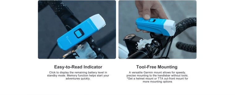 L’interface universelle Garmin™ permet une mise en place et un retrait instantanés du guidon. Sa conception compacte convient aussi parfaitement comme lampe de casque.