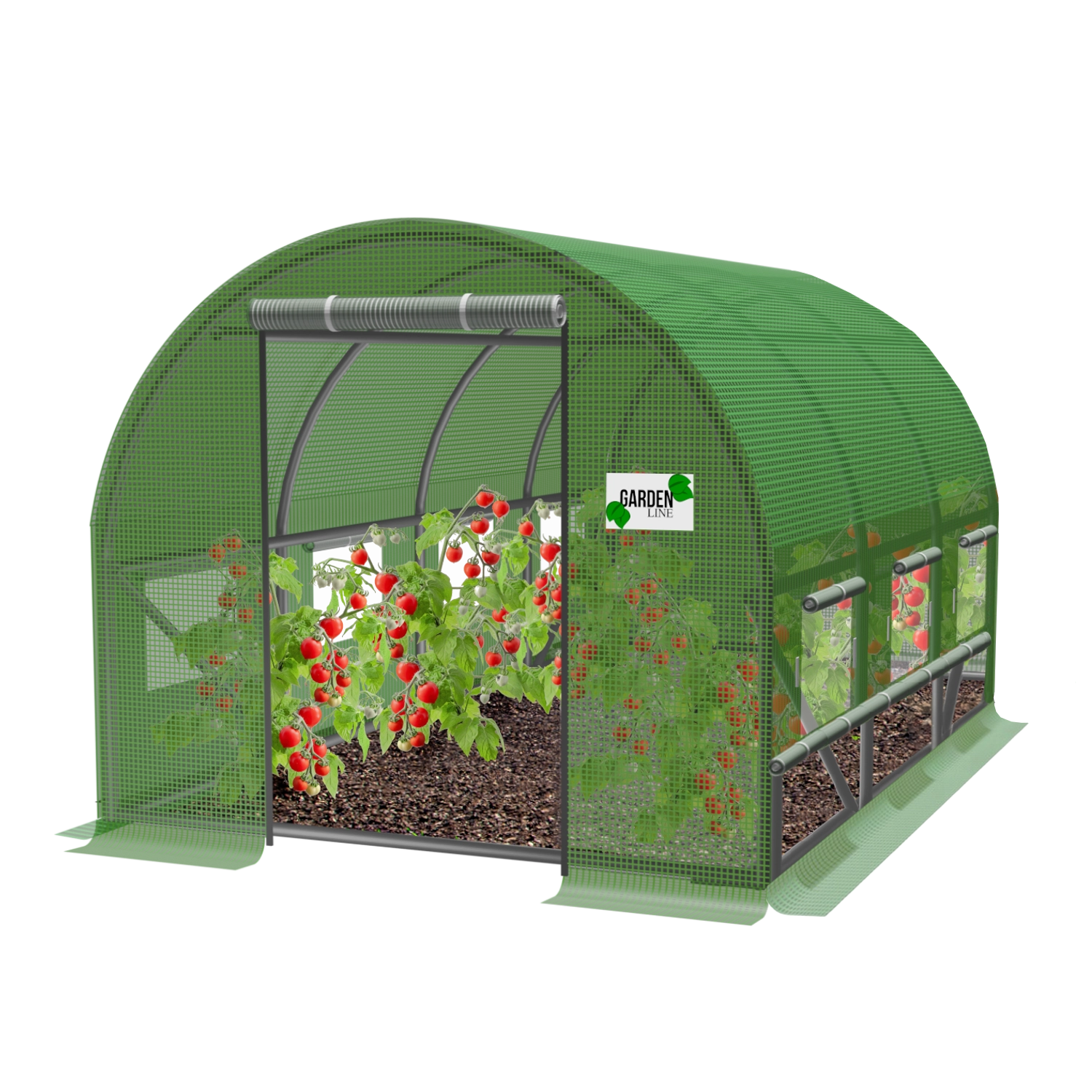 Des détails bien pensés améliorent le confort de culture : 6 fenêtres latérales avec moustiquaire pour une circulation d’air constante, porte frontale enroulable zippée pour un accès aisé et ventilation supplémentaire au bas du panneau pour évacuer l’excès de chaleur lors des journées chaudes. La lèvre de sol permet de la lester avec de la terre, améliorant la stabilité et l’étanchéité aux courants d’air.