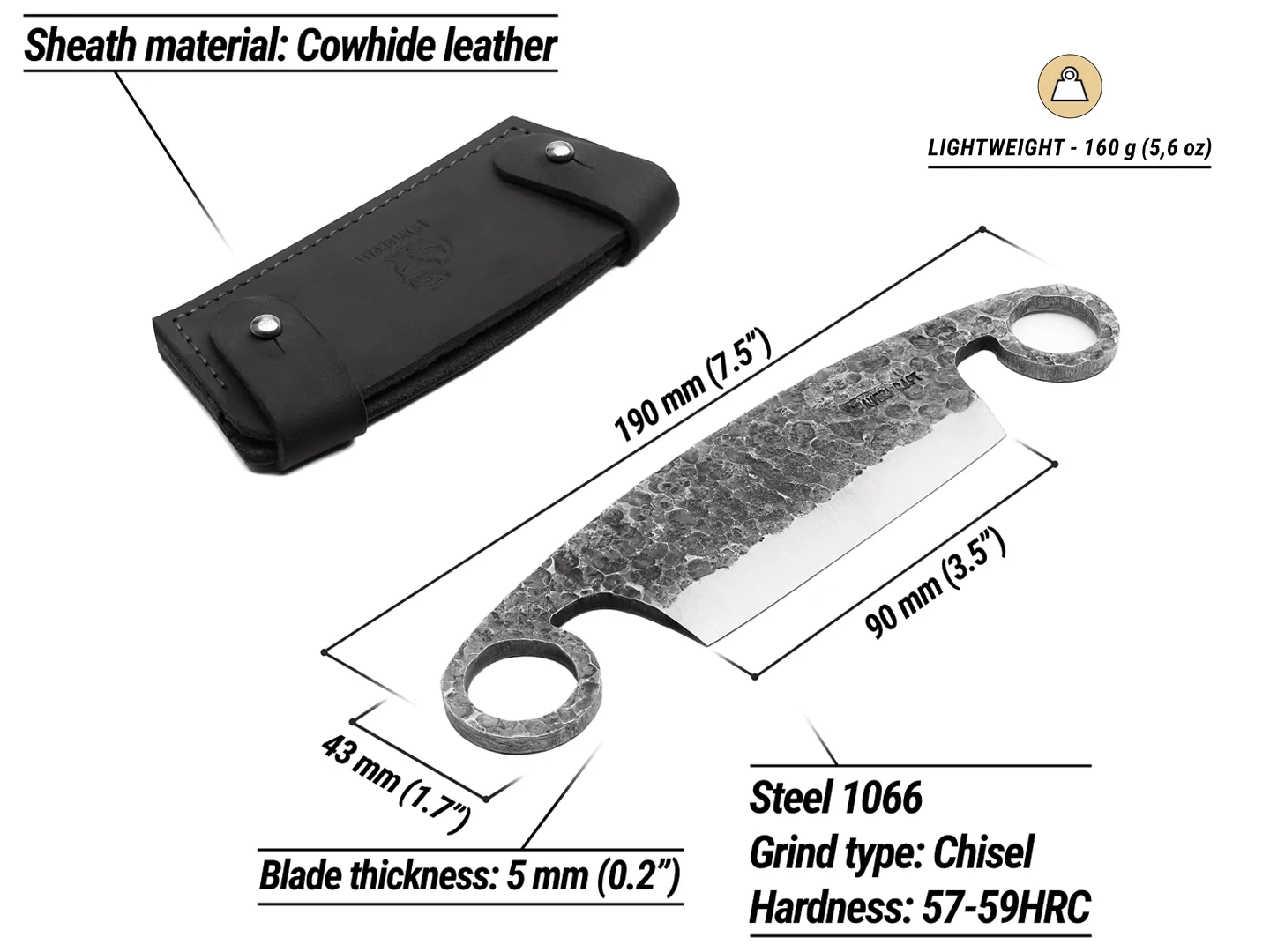 - Acier à haute teneur en carbone 1066 forgé à la main – longue tenue de tranchant et excellente aptitude à l’affûtage.