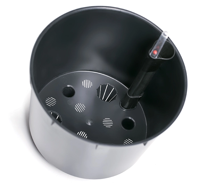 Un insert interne avec réservoir et jauge de niveau assure une humidité homogène et des arrosages moins fréquents.