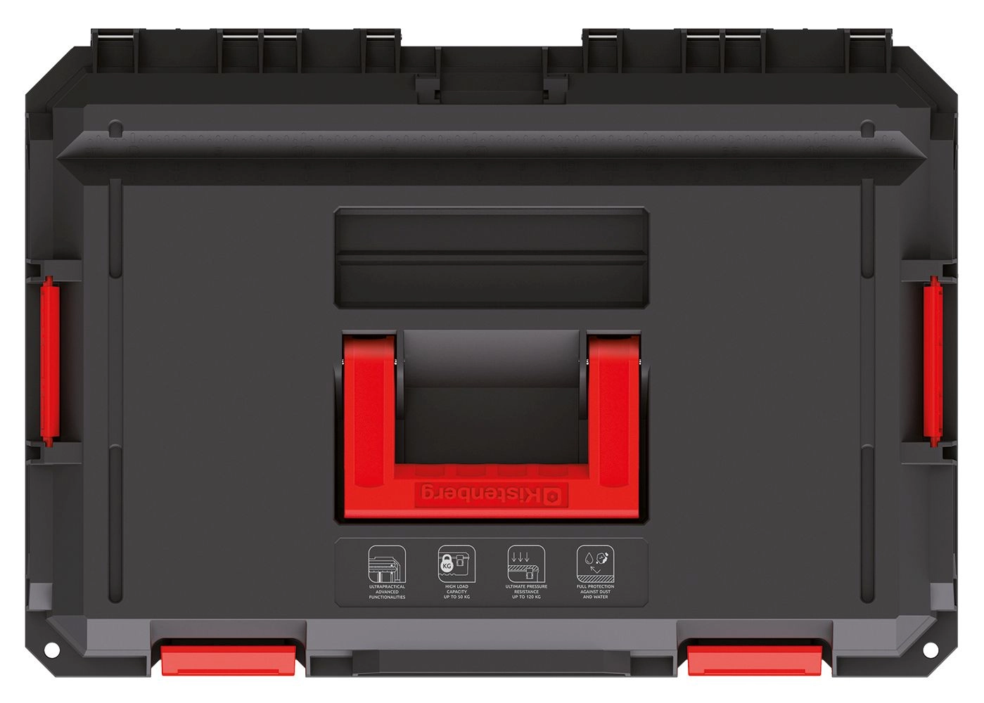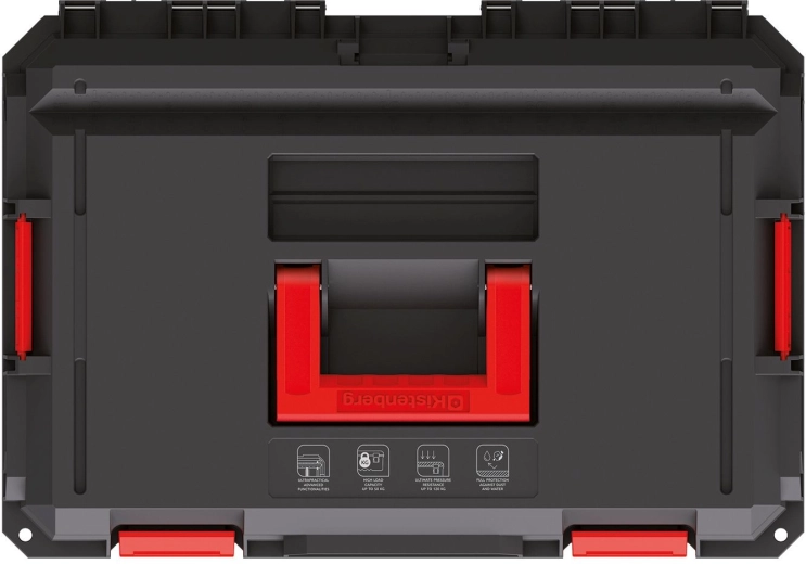Grâce au joint d’étanchéité intégré, la mallette est protégée contre la poussière et l’eau, tandis que les renforts nervurés augmentent la résistance aux dommages mécaniques. Certains modèles de couvercles disposent de rails en aluminium permettant une transformation rapide en établi compact.