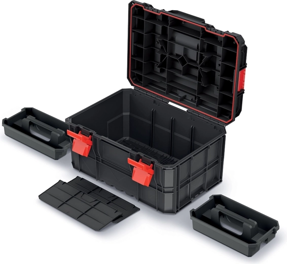 La mallette à outils X-Block Pro est conçue pour les professionnels qui ont besoin d’une solution fiable et robuste pour le transport et le stockage d’outils lourds. La construction modulaire permet le raccordement facile de plusieurs boîtes via des verrous latéraux, créant ainsi un système portable et stable.