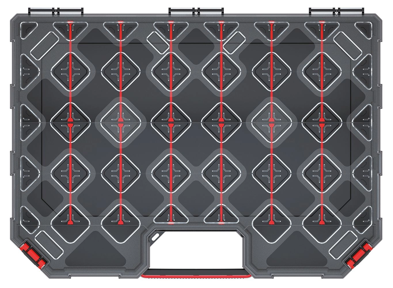 Grâce à ses dimensions compactes de 390 × 284 × 105 mm, l’organiseur se glisse facilement dans l’atelier, la voiture ou une mallette de montage. Des loquets de qualité maintiennent le couvercle fermement verrouillé et le corps robuste protège le contenu lors du transport. Idéal pour les professionnels comme pour les bricoleurs exigeant ordre, clarté et longue durée de vie de leur équipement.