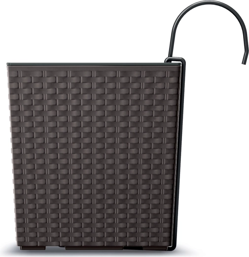 Jardinière suspendue au look rotin de couleur anthracite offrant un design élégant, une résistance aux UV et aux intempéries et des crochets pratiques pour rambarde. Structure légère mais solide avec un conteneur intérieur facilitant la plantation et l’entretien, idéale pour balcons, terrasses et cafés.