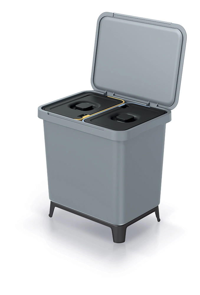 Deux inserts amovibles avec poignées pratiques permettent de séparer rapidement les plastiques, le papier et les déchets ménagers, et de les transporter aisément.