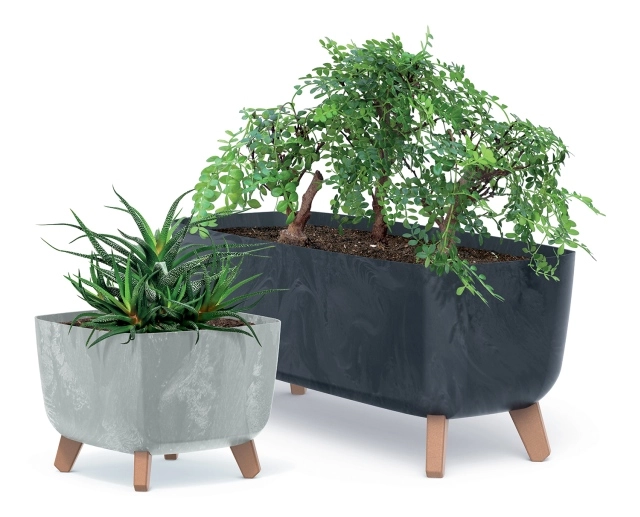 Quatre pieds stables à l’aspect bois assurent la circulation de l’air et l’espace pour l’évacuation de l’humidité, favorisant des racines saines et une surface propre sous la jardinière.