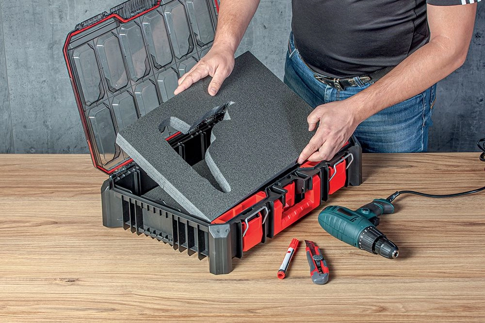 Le matériau en mousse à cellules fermées (PE) est résistant à l’humidité, aux moisissures et aux produits chimiques, ne génère pas de poussière et conserve sa forme dans le temps. L’insert convient également comme remplissage de protection des coins, pour l’isolation thermique et acoustique ou comme insert pour mallettes à outils.