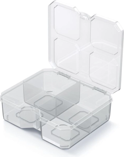 L’organiseur pratique SQR box aux dimensions 15,6 × 14 × 5 cm offre un rangement clair des petits objets à la maison, au bureau et à l’atelier. Grâce à sa conception transparente, trouvez rapidement ce dont vous avez besoin sans ouvrir. Quatre compartiments solides et des cloisons résistantes maintiennent vis, trombones et autres accessoires bien en place, tandis que le corps en plastique léger facilite la manipulation et le transport.