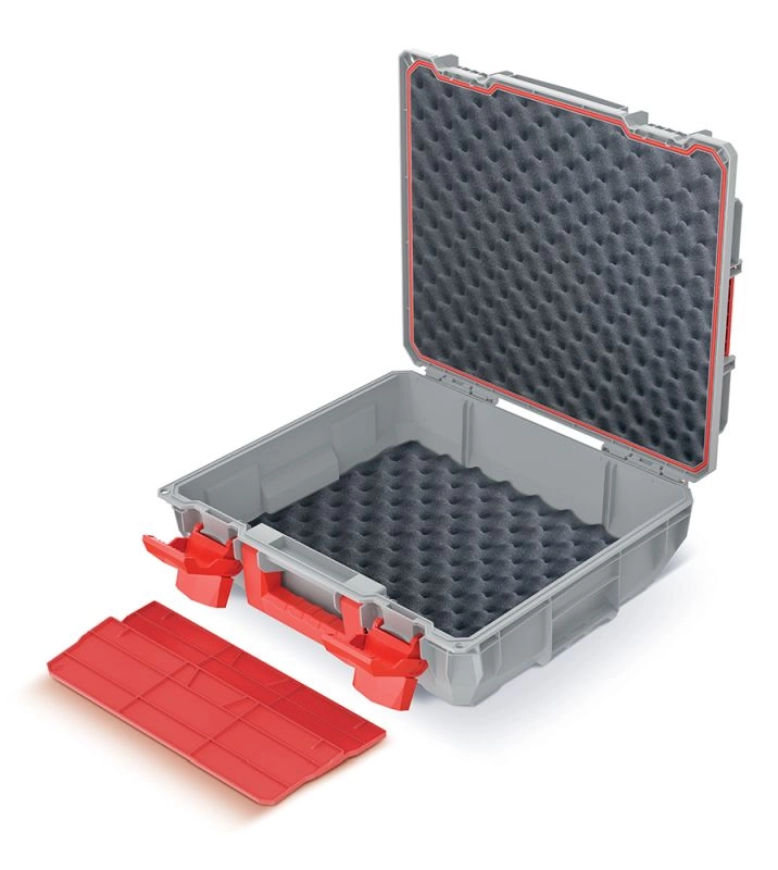 Grâce à l’IP55, elle résiste à la poussière et aux projections d’eau, tandis que les verrous en ABS maintiennent solidement le couvercle fermé. Deux cloisons amovibles permettent de configurer l’espace intérieur selon les besoins du moment et la poignée intégrée facilite la manipulation, même à pleine charge jusqu’à 25 kg. Ses dimensions compactes de 45 × 38 × 13,5 cm trouvent facilement leur place à l’atelier, dans la voiture ou en service.