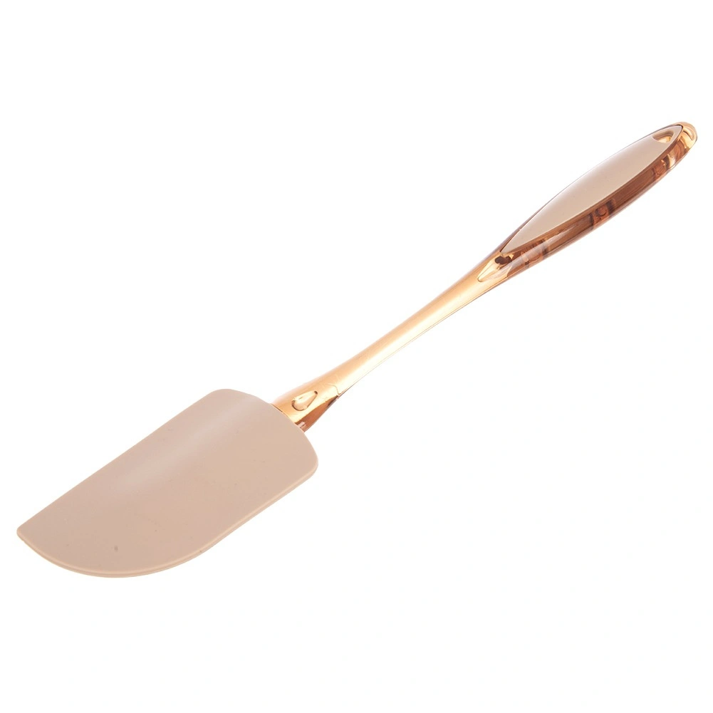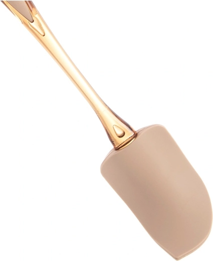 Spatule de cuisine universelle en silicone dans une élégante couleur beige, idéale pour mélanger, prélever et étaler crèmes, glaçages et pâtes. Sa tête flexible épouse délicatement la forme du bol et racle parfaitement les restes sur les parois sans rayer la surface.