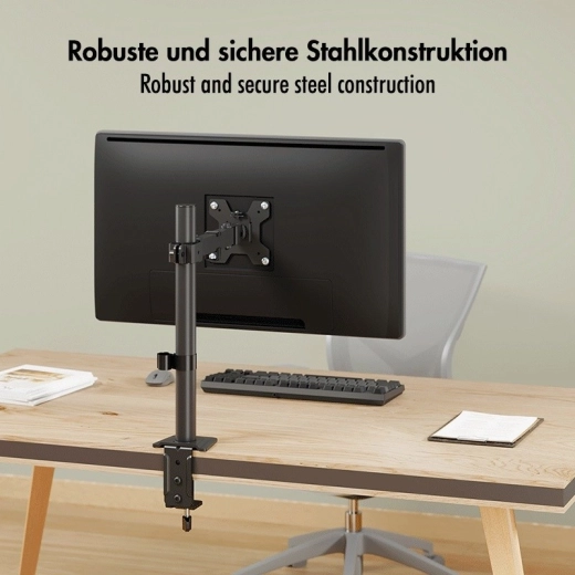 La construction en acier stable combinée à des éléments plastiques de qualité offre un soutien fiable pour des moniteurs jusqu’à 10 kg. Le montage est rapide et flexible : choisissez entre une fixation au bord du bureau (pince en C) ou un montage par passe-câbles (grommet). La gestion des câbles intégrée et la plaque VESA amovible simplifient l’installation et l’usage quotidien.