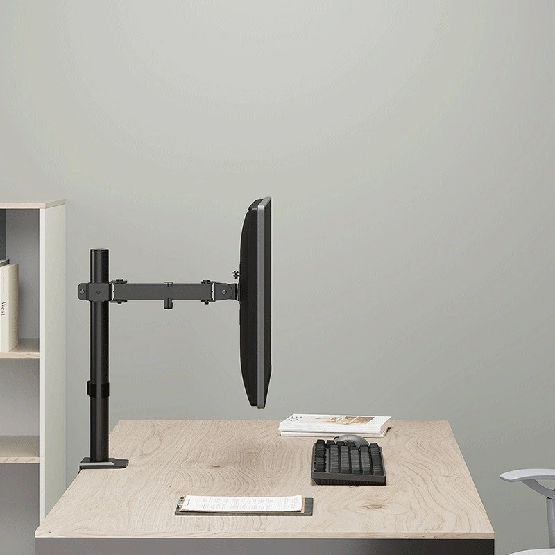 Le support permet de positionner précisément l’écran pour une ergonomie optimale. Grâce à la tige de guidage de 40,8 cm et au bras articulé avec une portée jusqu’à 20,2 cm, réglez facilement la hauteur, la profondeur et la position. La plage d’inclinaison de +/‑ 45°, la rotation latérale de +/‑ 90° et la rotation à 360° (pivot) facilitent le passage entre les modes paysage et portrait.