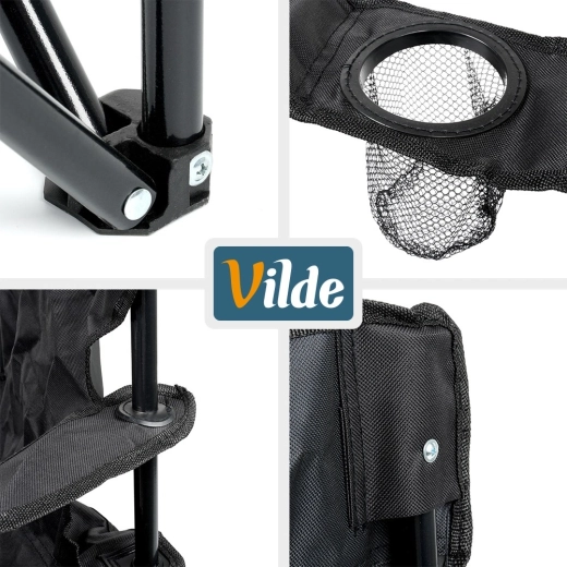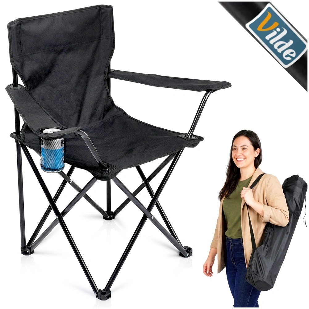 Chaise de camping légère et compacte avec une structure métallique robuste et une housse en polyester résistant de couleur noire. Se plie facilement, se range dans un étui de transport avec sangle et offre des accoudoirs avec porte-gobelet. Idéale pour le camping, la pêche, la plage et le jardin, avec une capacité de charge jusqu’à 120 kg et une résistance aux intempéries.